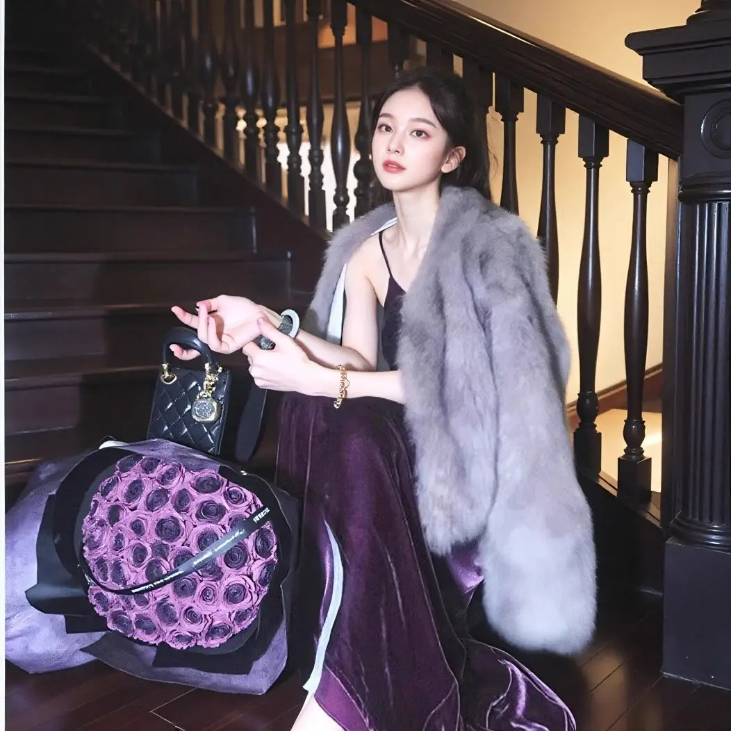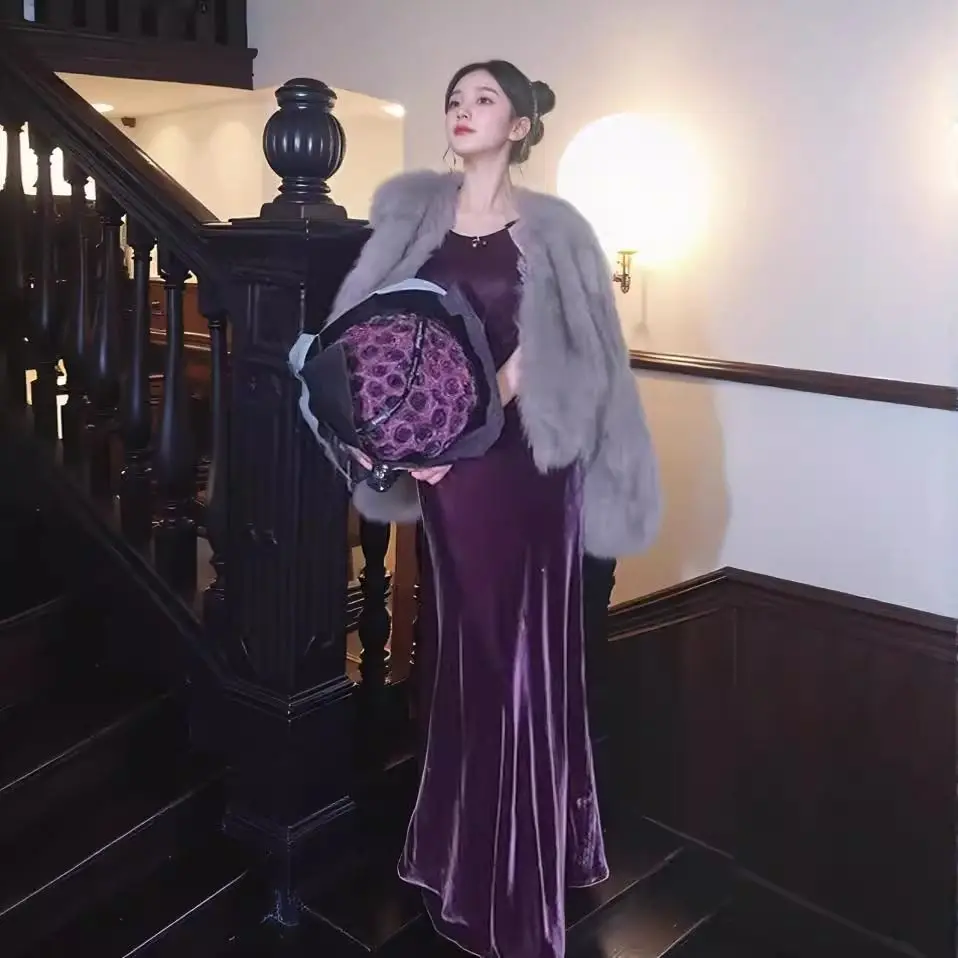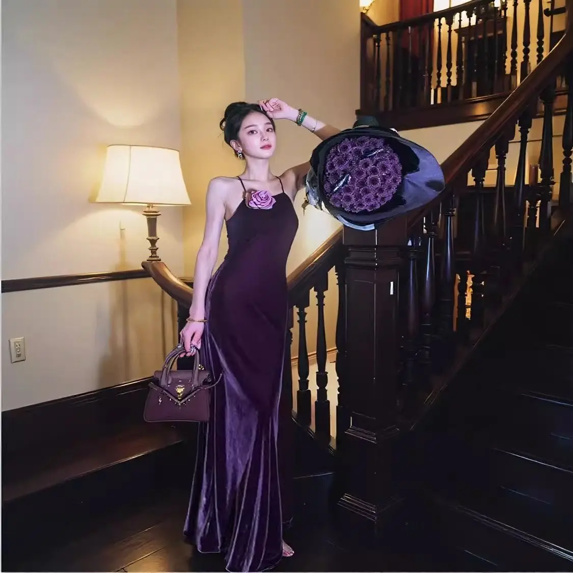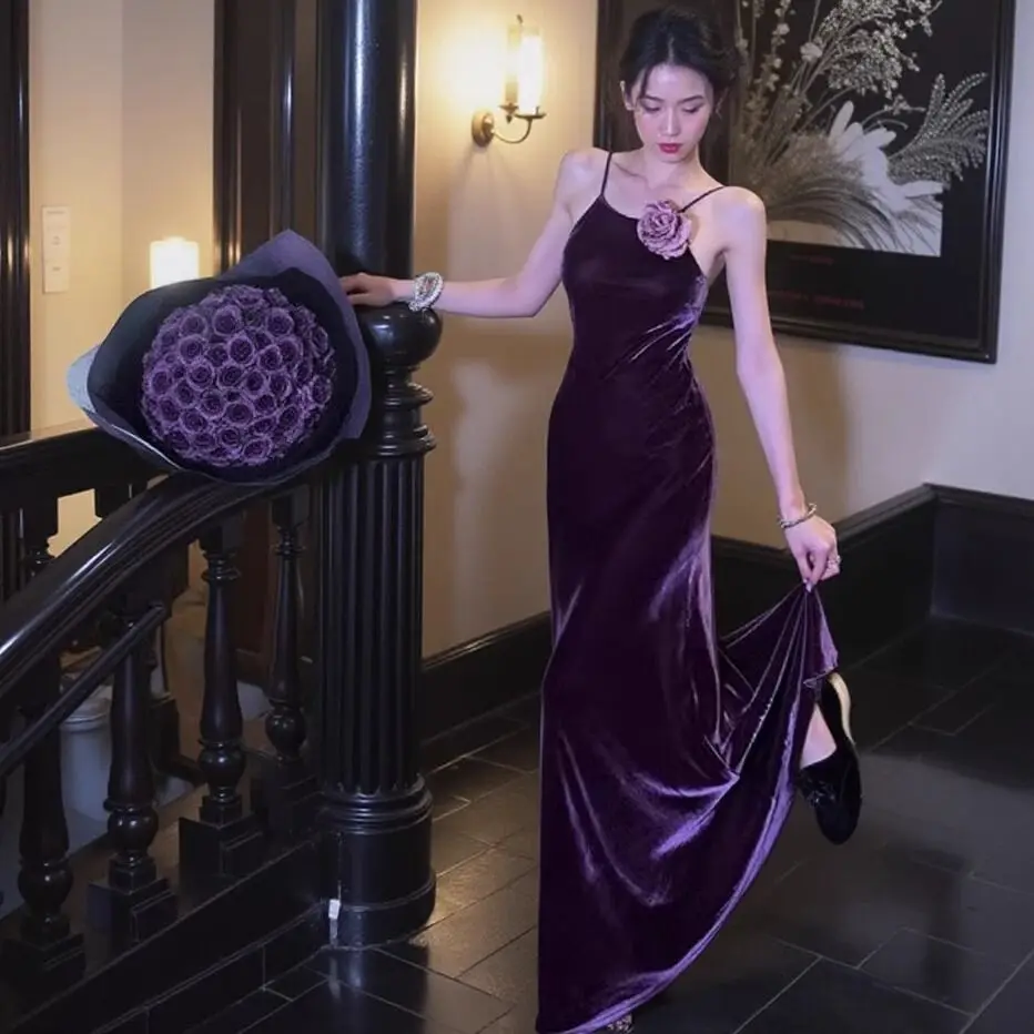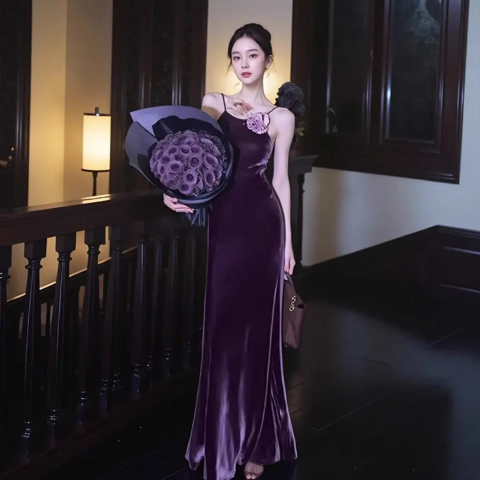 TAVIMART - New Chinese Style Halter Spaghetti Straps Fishtail Skirt Light Luxury High Grade Velour Camisole Gown Birthday Banquet