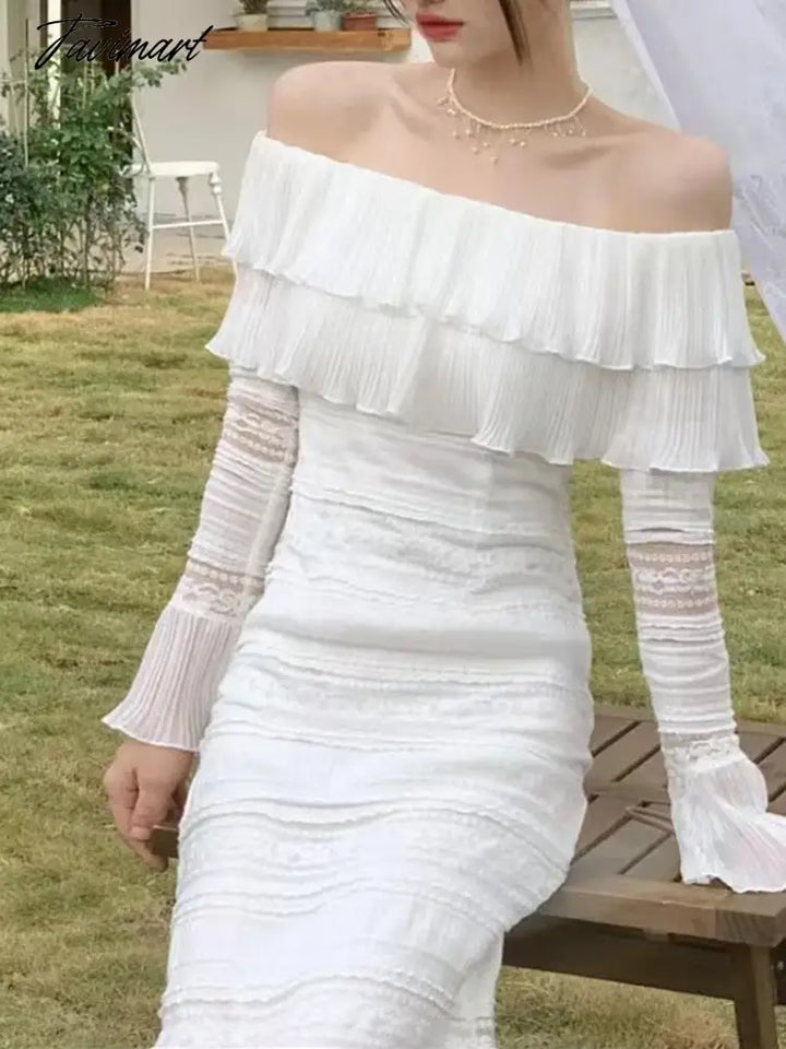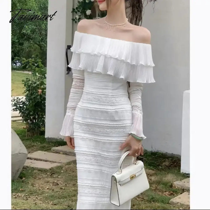 Tavimart New Fashion Runway Spring White Midi Dress Women's Sexy Off Shoulder Ruffle Elegant Holiday Party Dress Vestido Da Festa