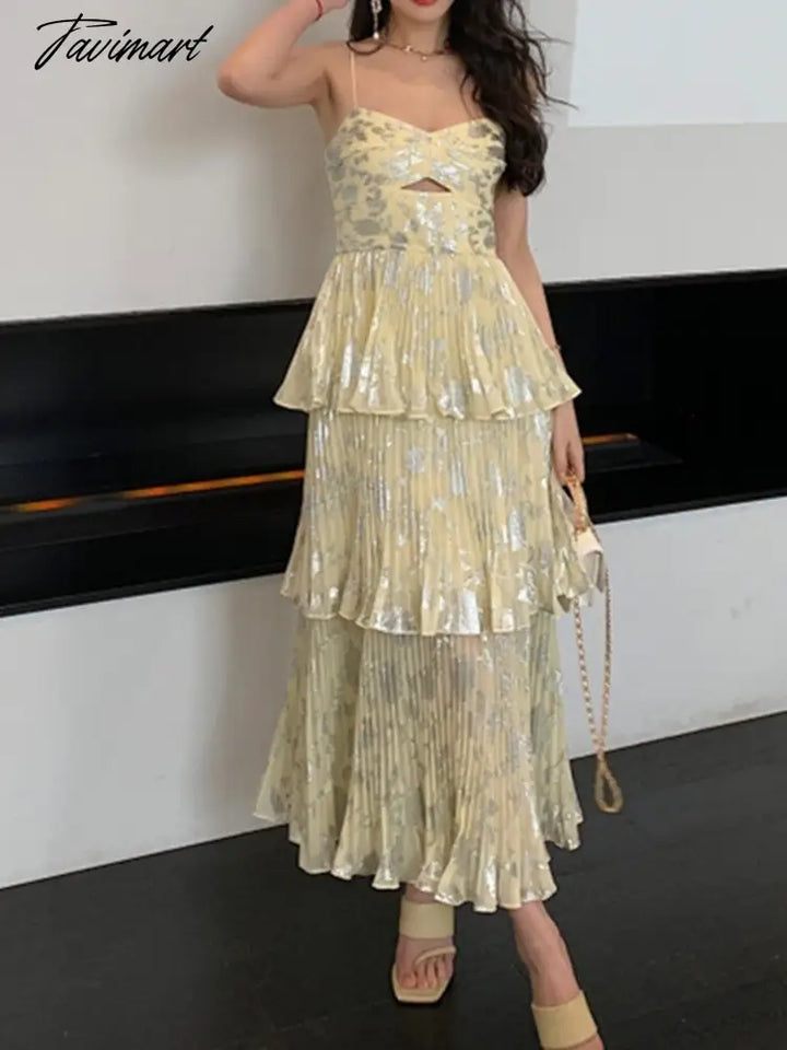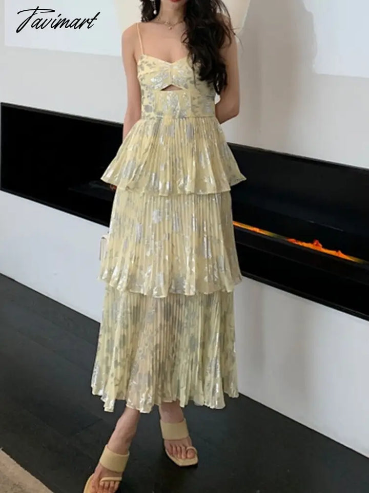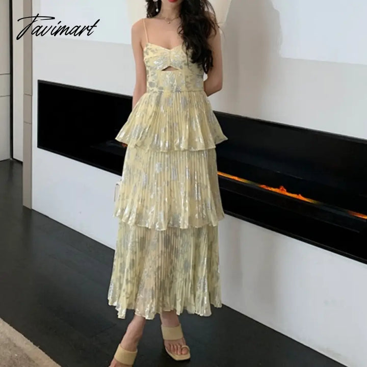 Tavimart New Fashion Sexy Yellow Chiffon Pleated Cake Spaghetti Strap Dress Women Hollow Out Holiday Beach Dress Robe Female Clothing