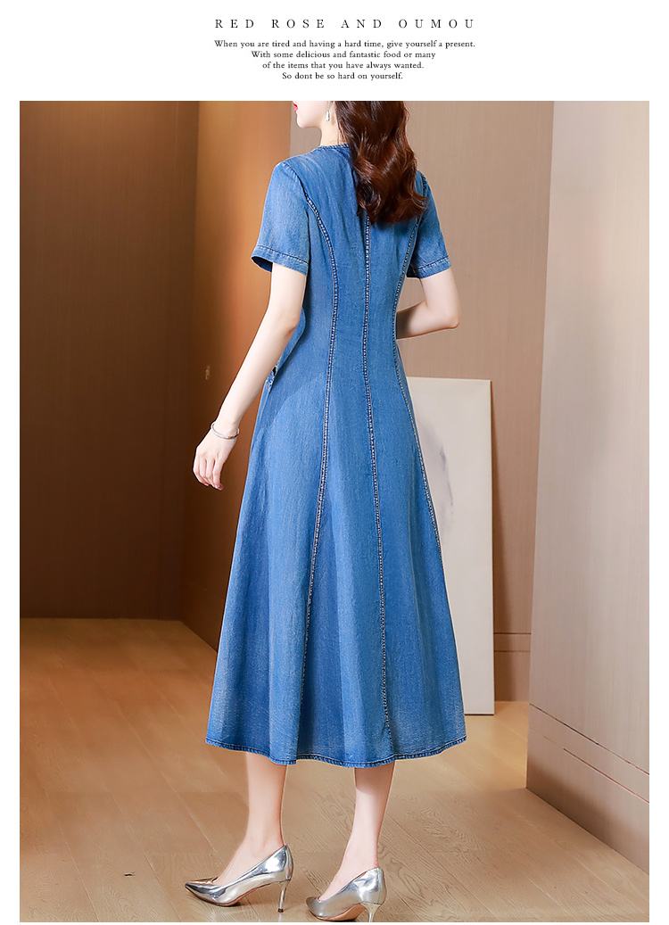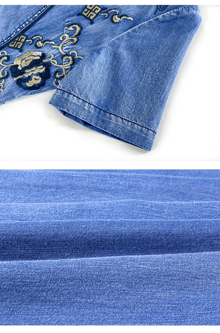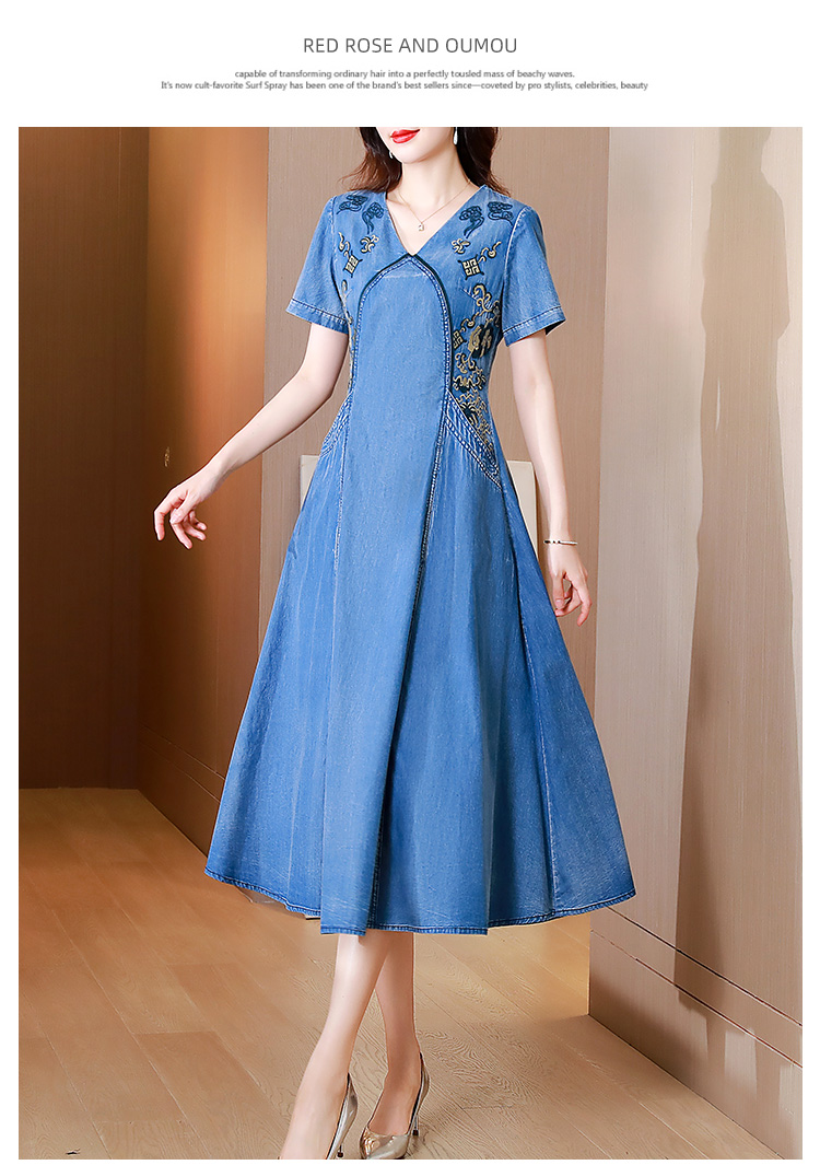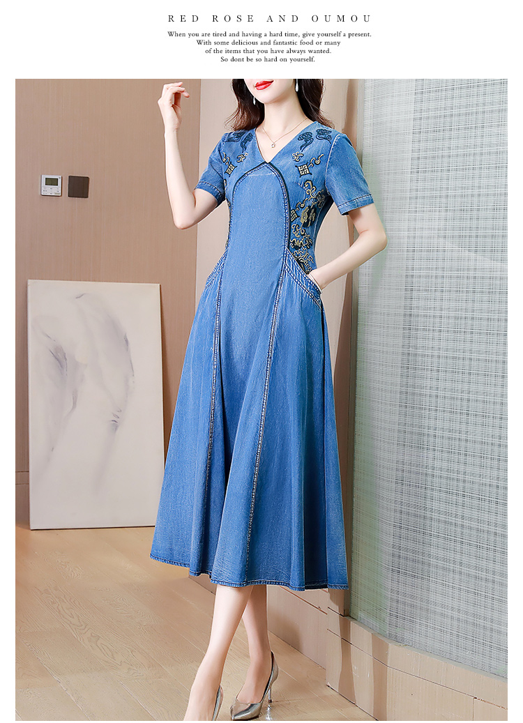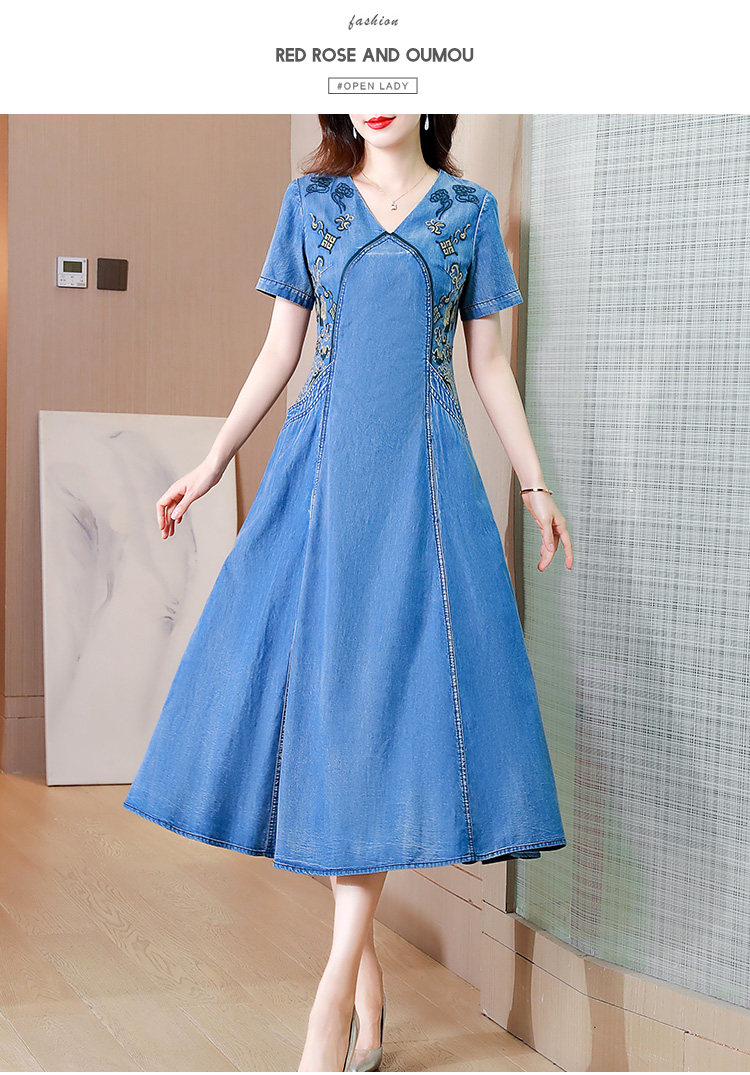 Tavimart New Free Shipping Vintage Women Long Mid-Calf Summer Denim M-2XL Short Sleeve Embroidery V-Neck Chinese Style Dresses