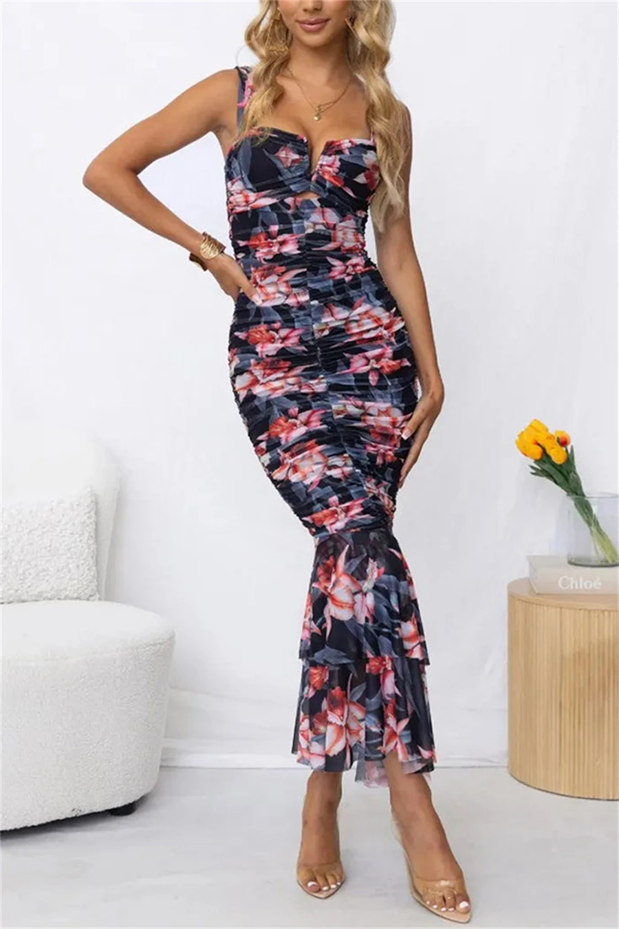 TAVIMART - New Summer Printed Casual Sling Sleeveless Dress Zipper Slim-Fit Dress Pullover V-Neck Dress Vacation Women's Clothing