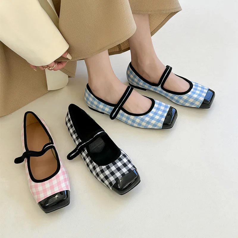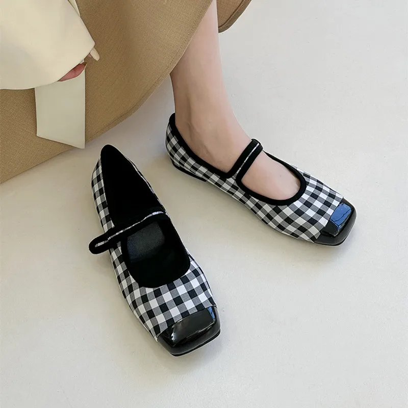 Tavimart New Women Flats Square Toe Retro Single Shoes Buckle Checkerboard Mary Jane Shoes Soft Ballerina Flats Mujer