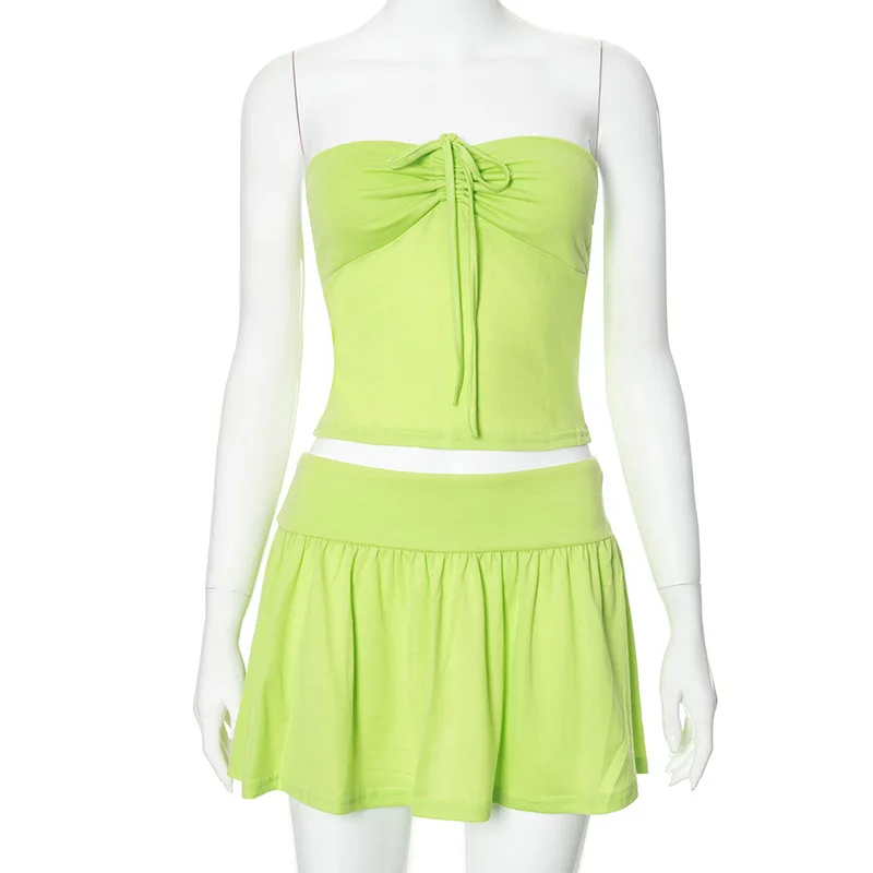 TAVIMART - Pleated Solid Slim Fit Skirts Set Sleeveless Strapless Sexy Backless Lace Up Top Spicy Girl Wrapped Hip Skirt Suit