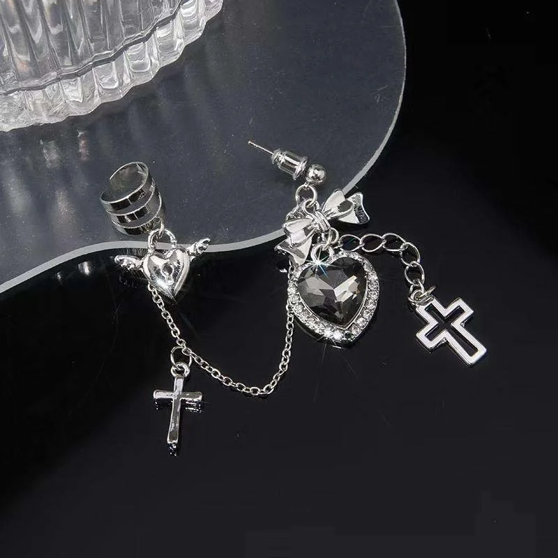 TAVIMART - Punk Gothic Black Crystal Heart Cross Chain Ear Cuff for Men Women Hip Hop Metal Cross Ear Clip On Earrings Egirl Jewelry Gift