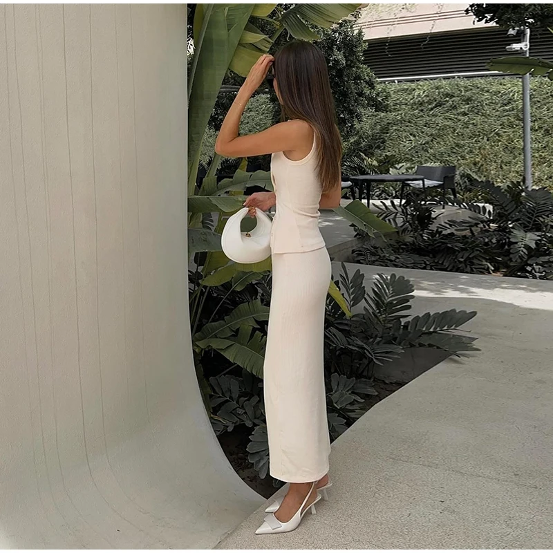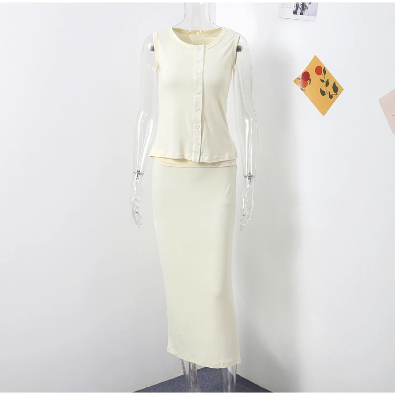TAVIMART - Retro Knitted Vest Slim Skirt Woman's Set Elegant Solid Sleeveless Single Breasted Vests High Waist Long Skirts Sets Female Chic