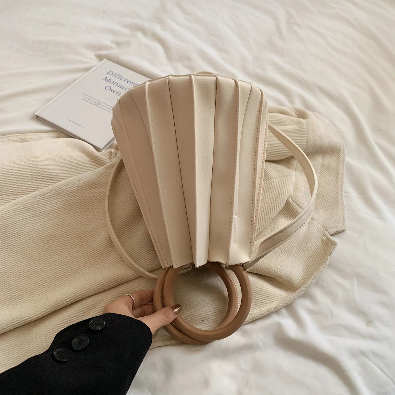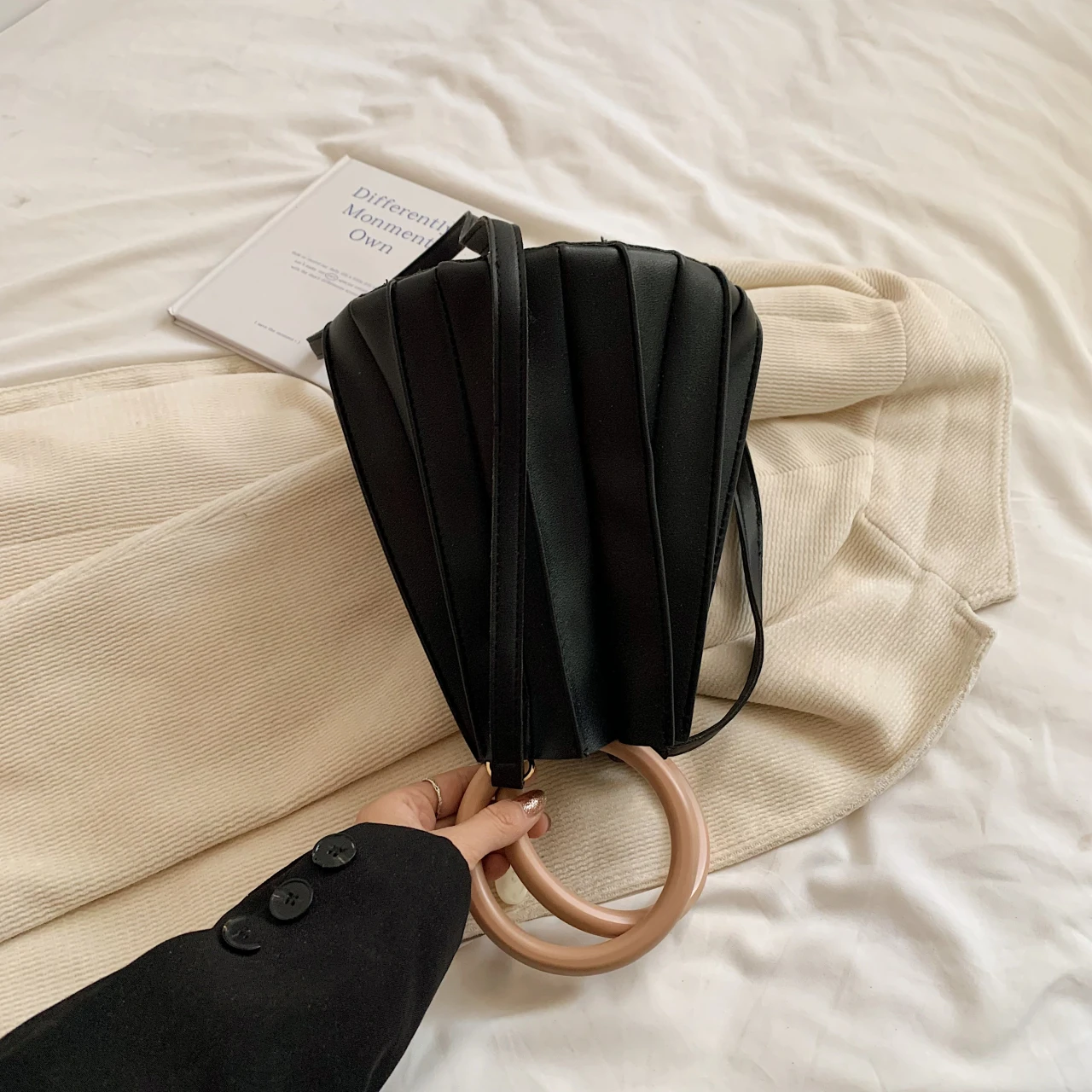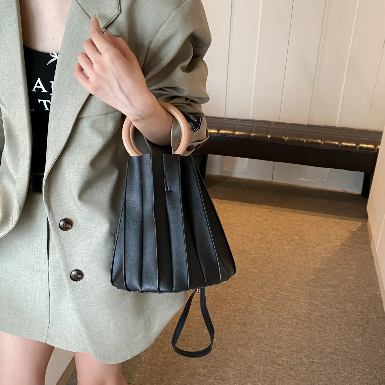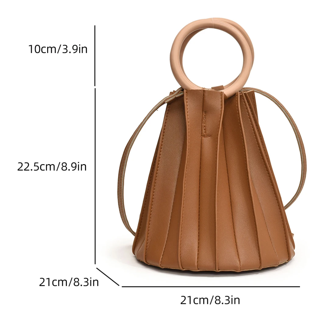 TAVIMART - Retro Round Wood Handle Tote Clutch Bag For Women Designer Pleated Striped Bucket Handbag Pu Leather Shoulder Crossbody Bags
