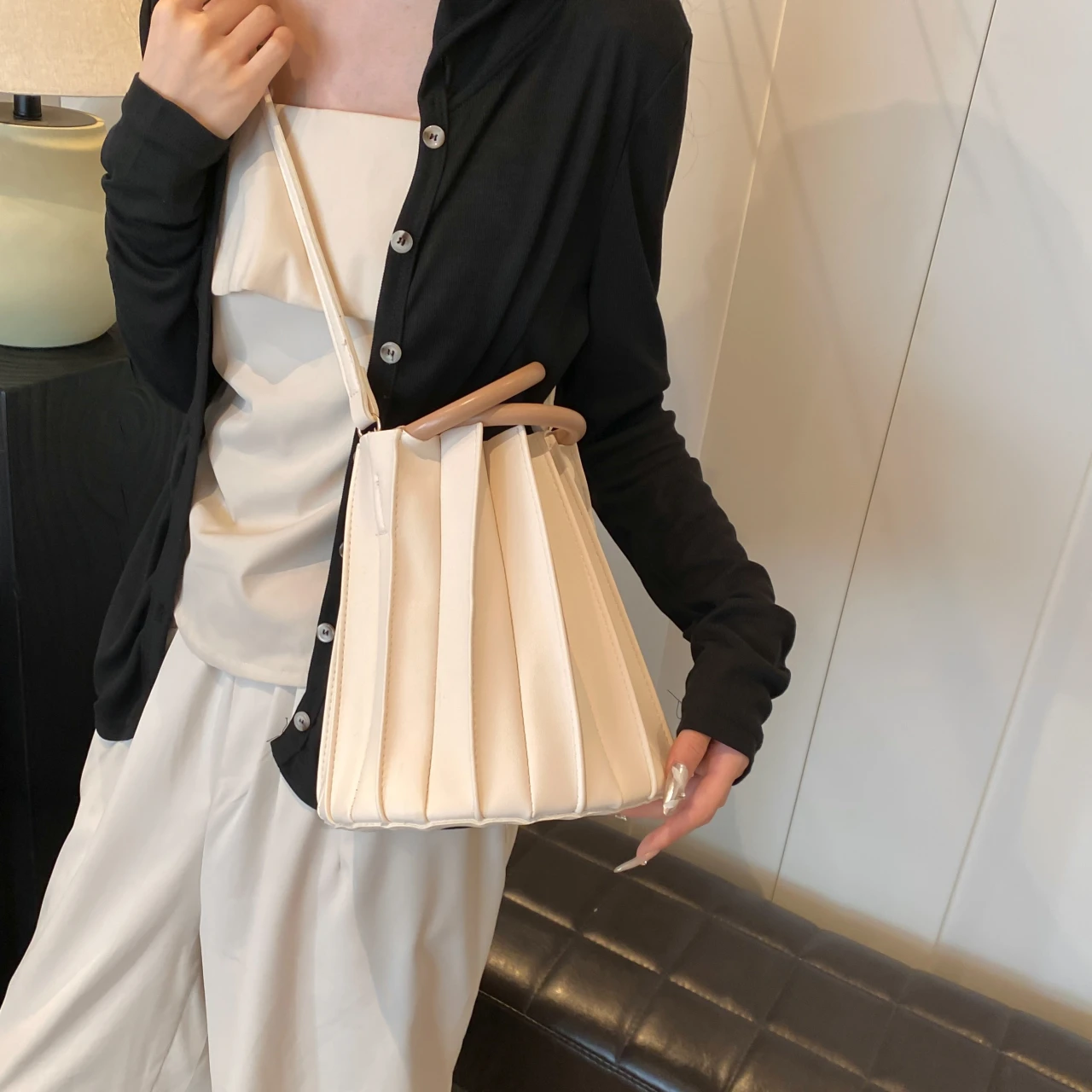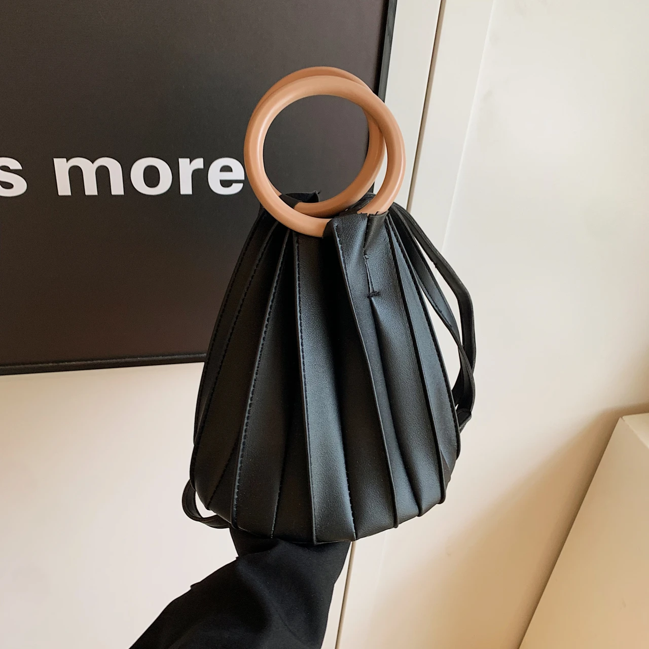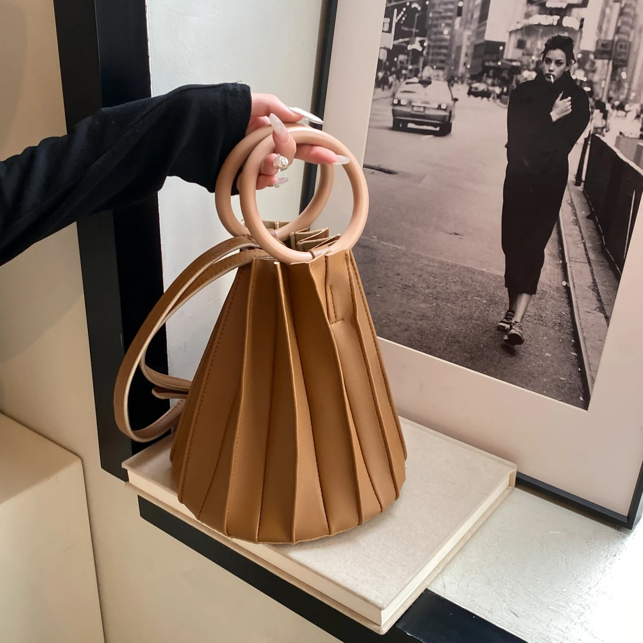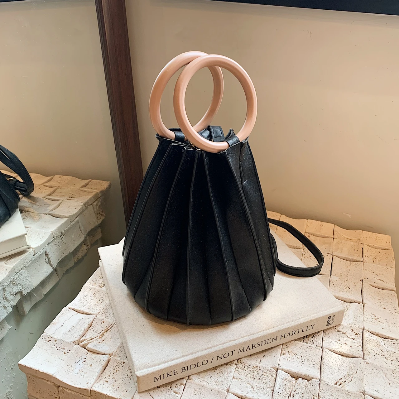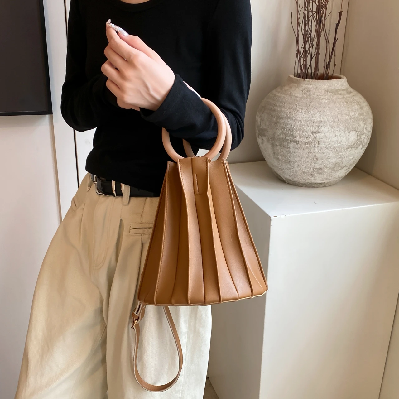 TAVIMART - Retro Round Wood Handle Tote Clutch Bag For Women Designer Pleated Striped Bucket Handbag Pu Leather Shoulder Crossbody Bags