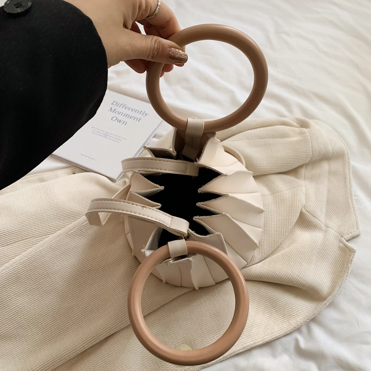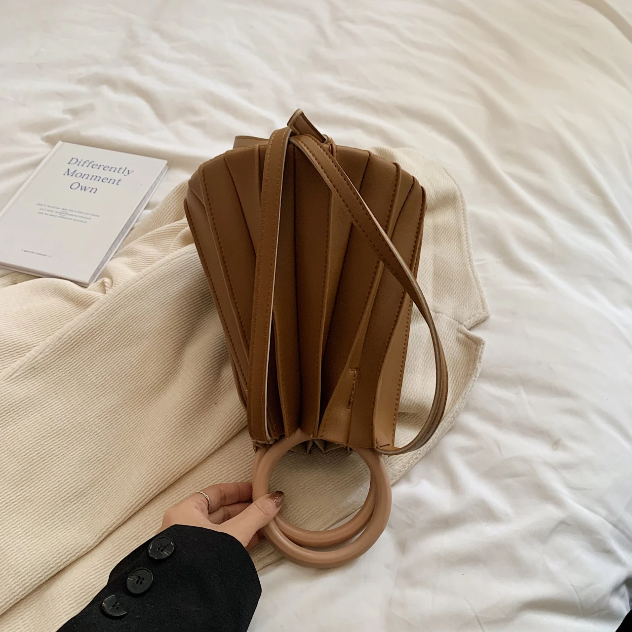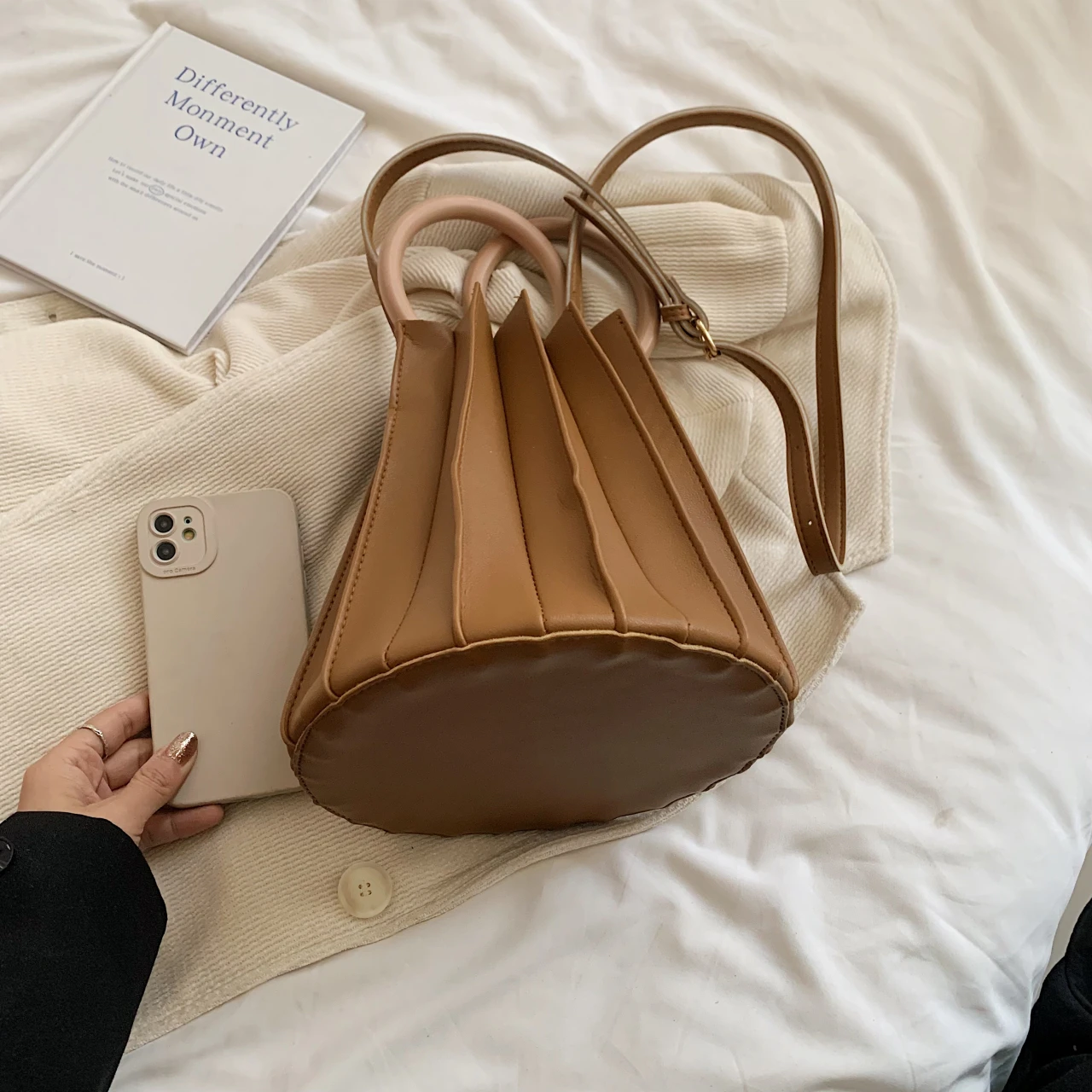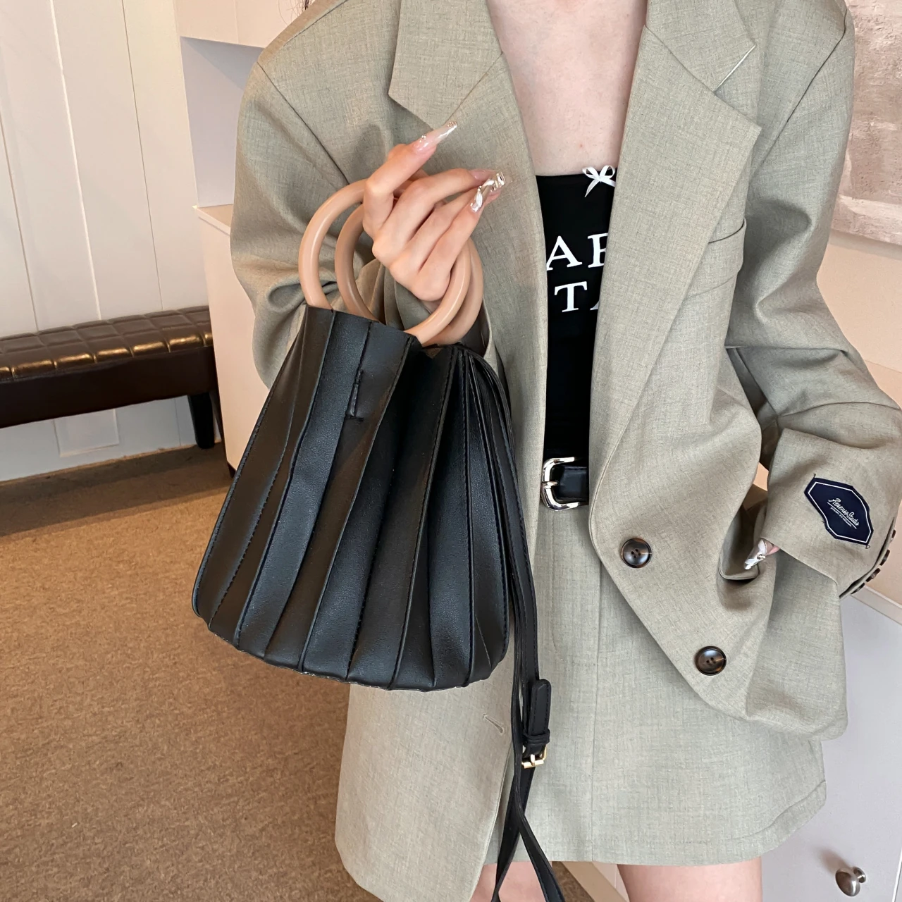 TAVIMART - Retro Round Wood Handle Tote Clutch Bag For Women Designer Pleated Striped Bucket Handbag Pu Leather Shoulder Crossbody Bags