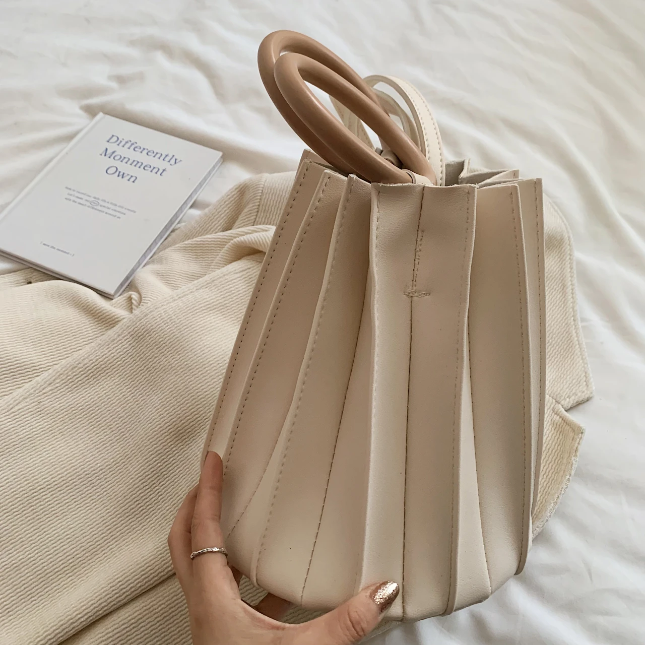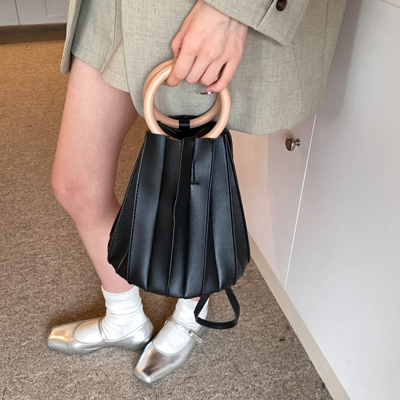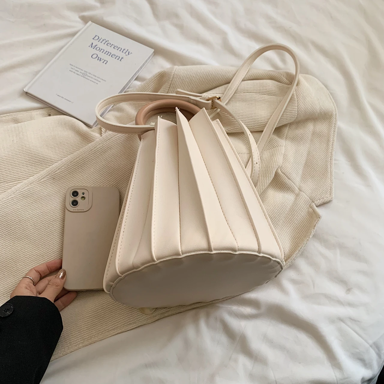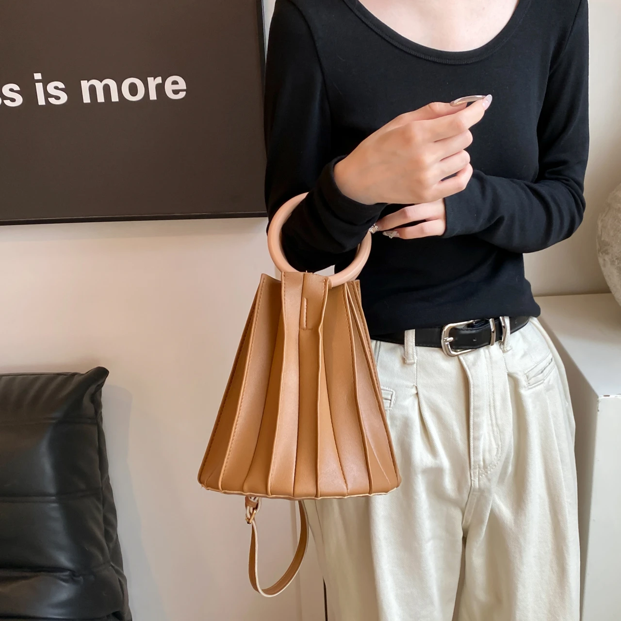TAVIMART - Retro Round Wood Handle Tote Clutch Bag For Women Designer Pleated Striped Bucket Handbag Pu Leather Shoulder Crossbody Bags