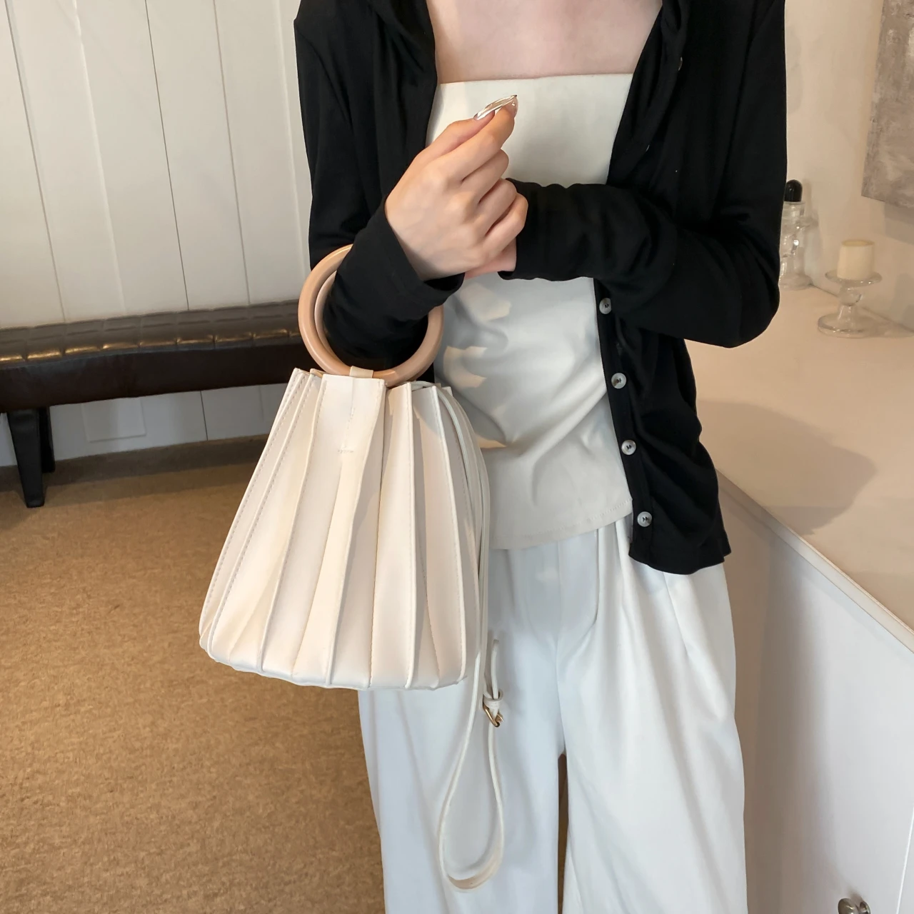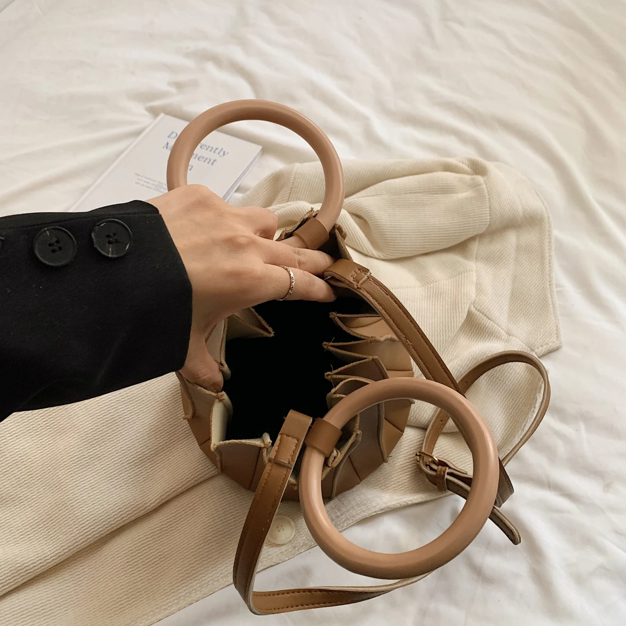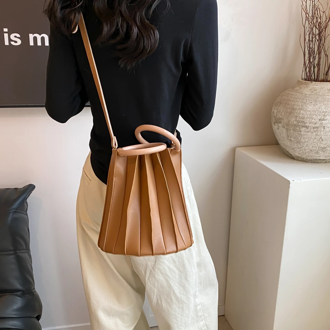 black bucket bag, white bucket bag, brown bucket bag |