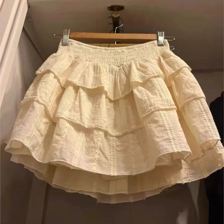 TAVIMART - Ruffle A-line Sweet Short Skirts Elastic Waist Women Summer Skirt Hollow Out Embroidery Beige Casual Skirt Academic Style