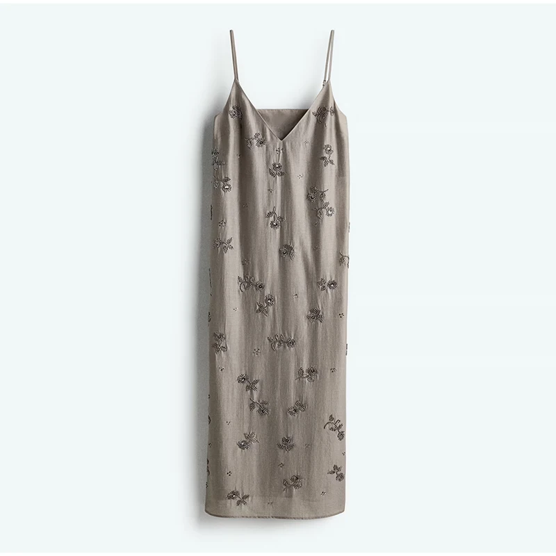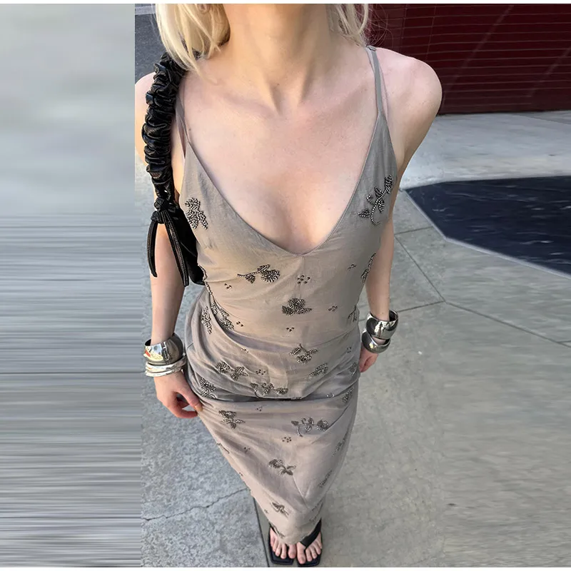 TAVIMART - Sexy Beaded Embroidery Long Sling Dress Women Loose V-neck Sleeveless Backless Holiday Dresses 2025 Summer Lady Beach Robes New