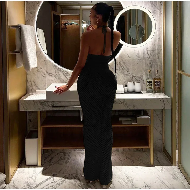 TAVIMART - Sexy Knit Halter Long Dress Women Hollow Out Backless Sleeveless Slim Beach Dresses Female 2025 Summer Fashion Lady Slim Robes