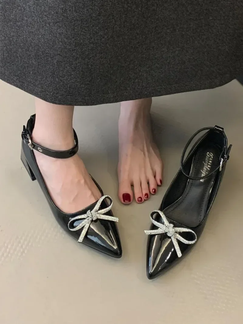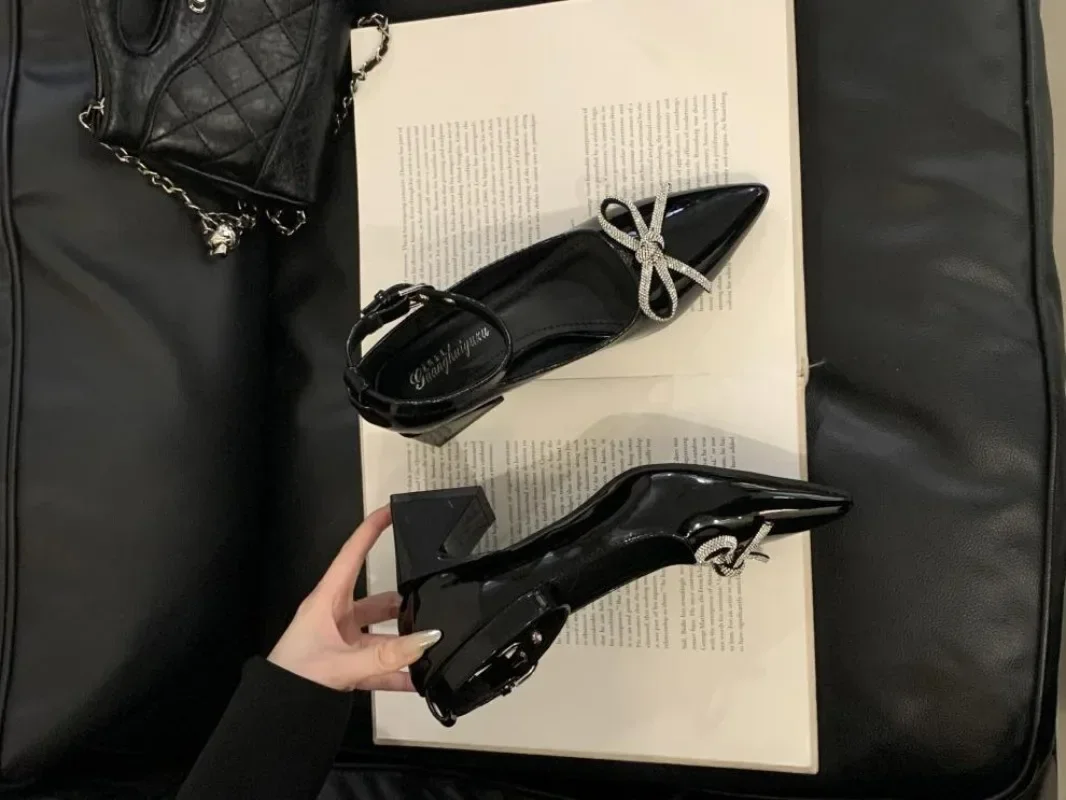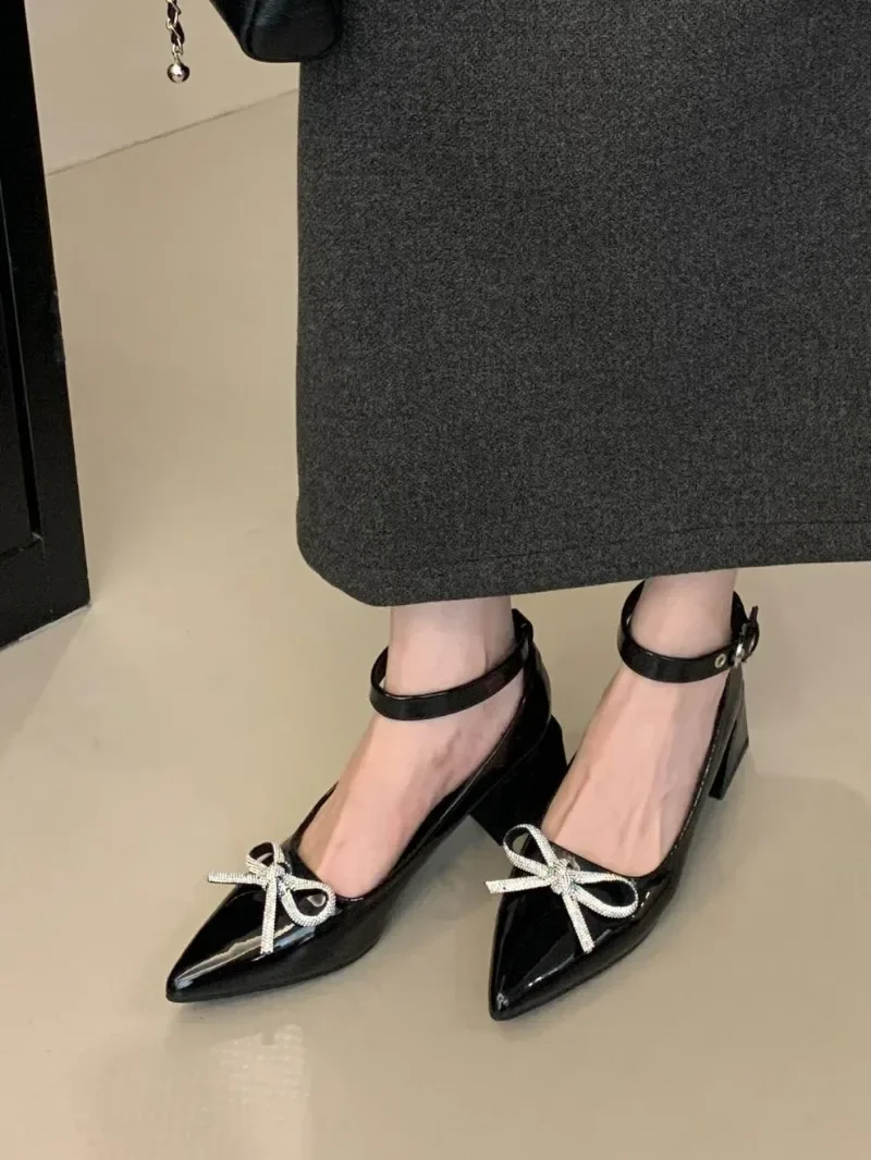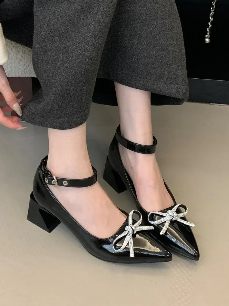TAVIMART - Sexy Rhinestone Bow Design High Heels Women 2025 New Pointed Toe Thick Heel Mary Jane Shoes Black Ankle Buckle Heeled Sandals