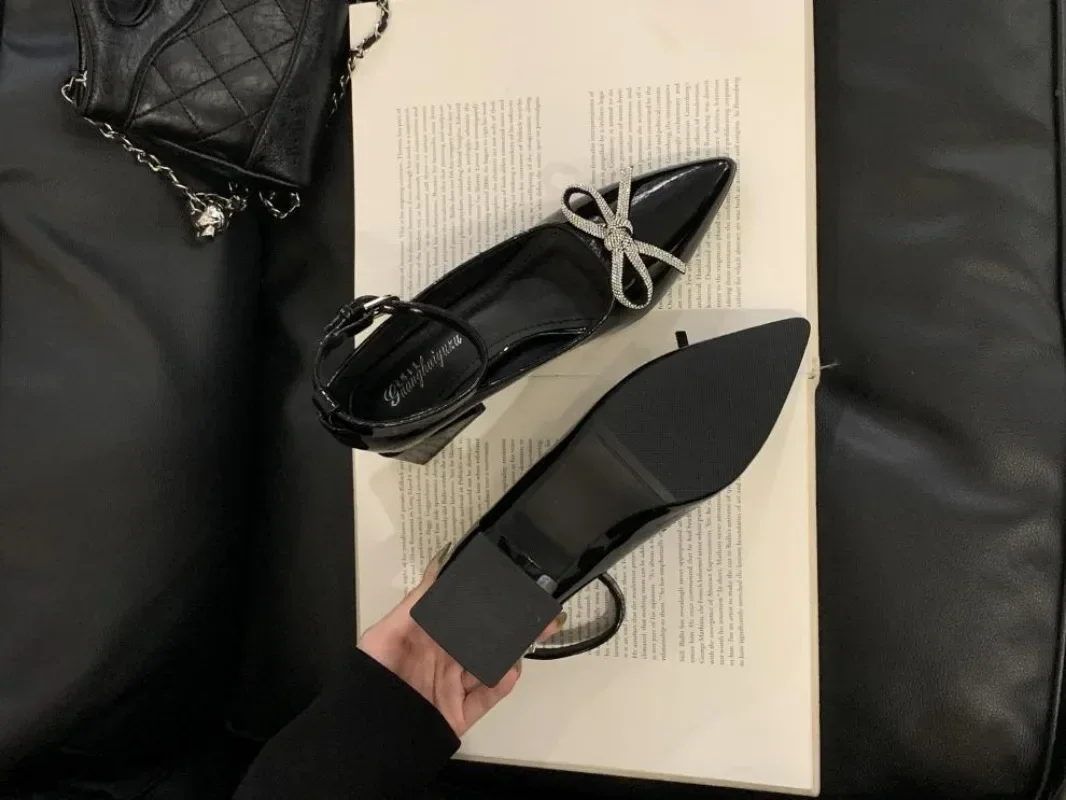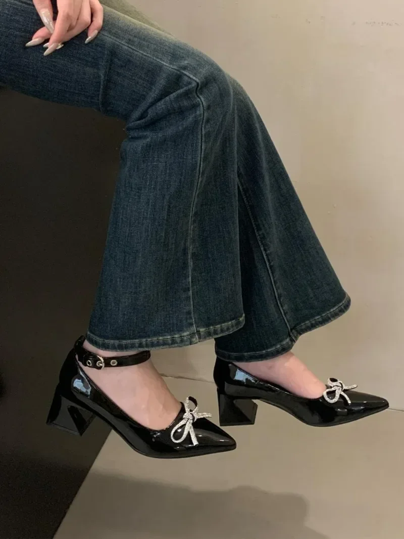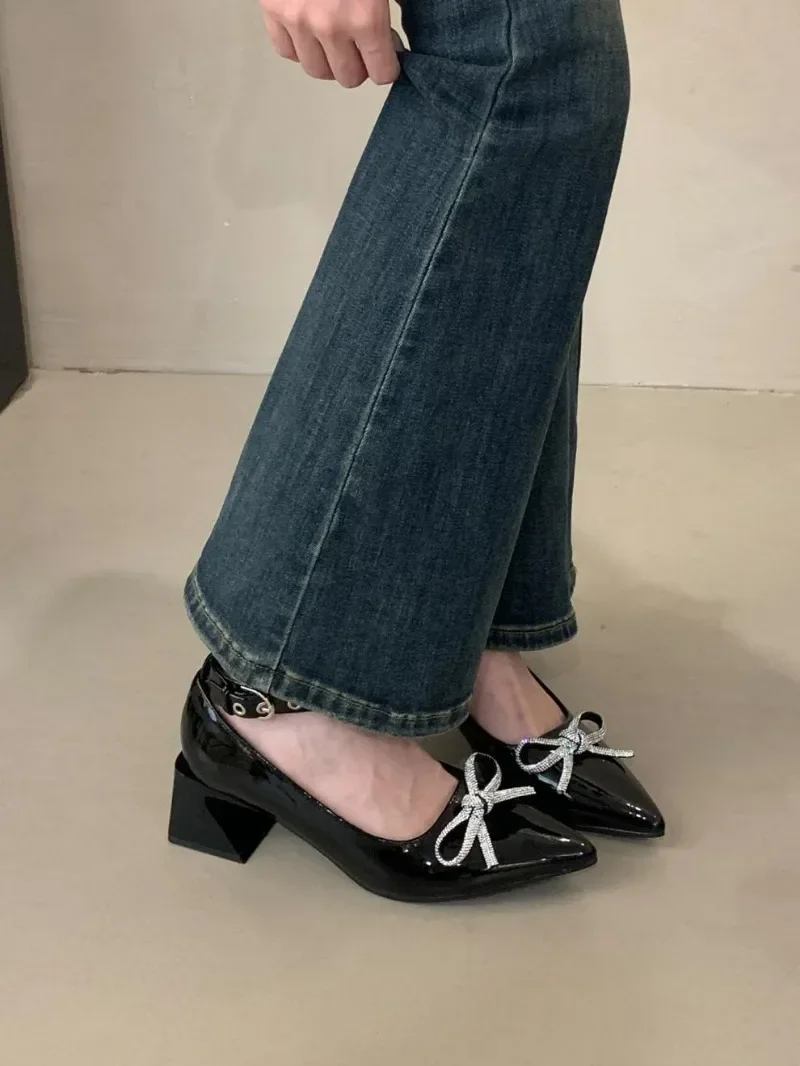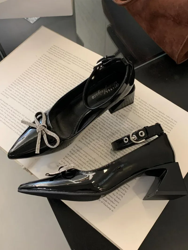 TAVIMART - Sexy Rhinestone Bow Design High Heels Women 2025 New Pointed Toe Thick Heel Mary Jane Shoes Black Ankle Buckle Heeled Sandals