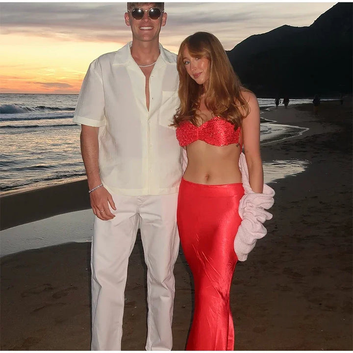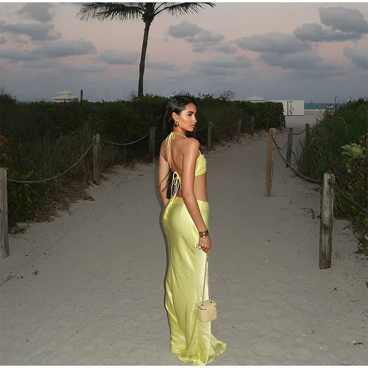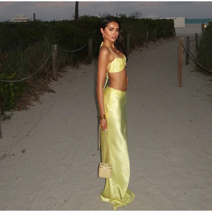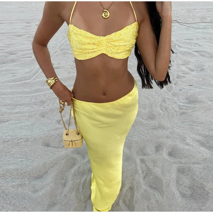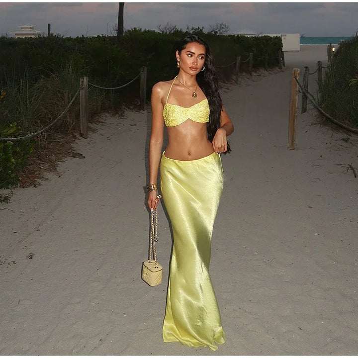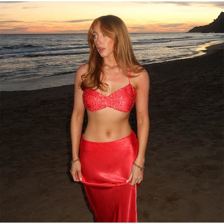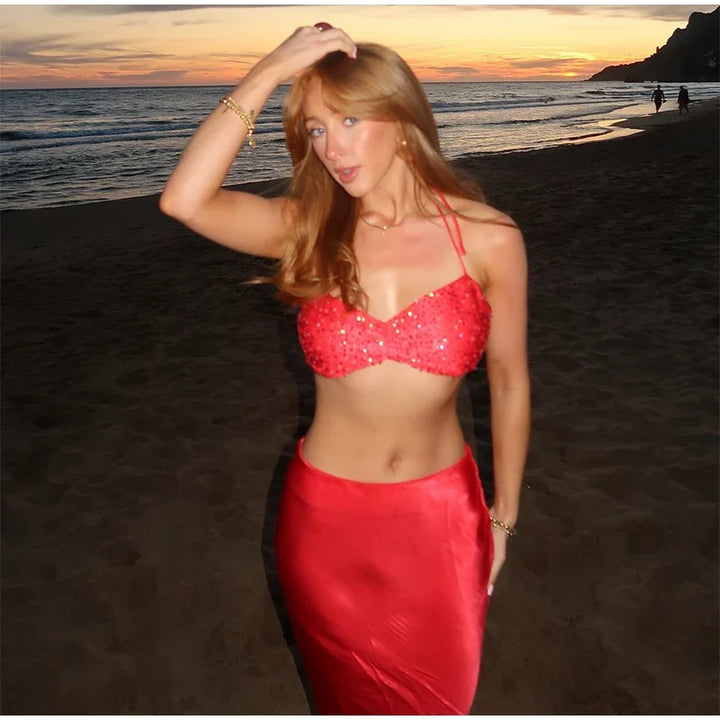 TAVIMART - Sexy Sequined Bikini Top Skirt Sets Women Halter Lace Up Backless Crop Top Hip Package Long Skirts 2025 Summer Lady Beach Suits