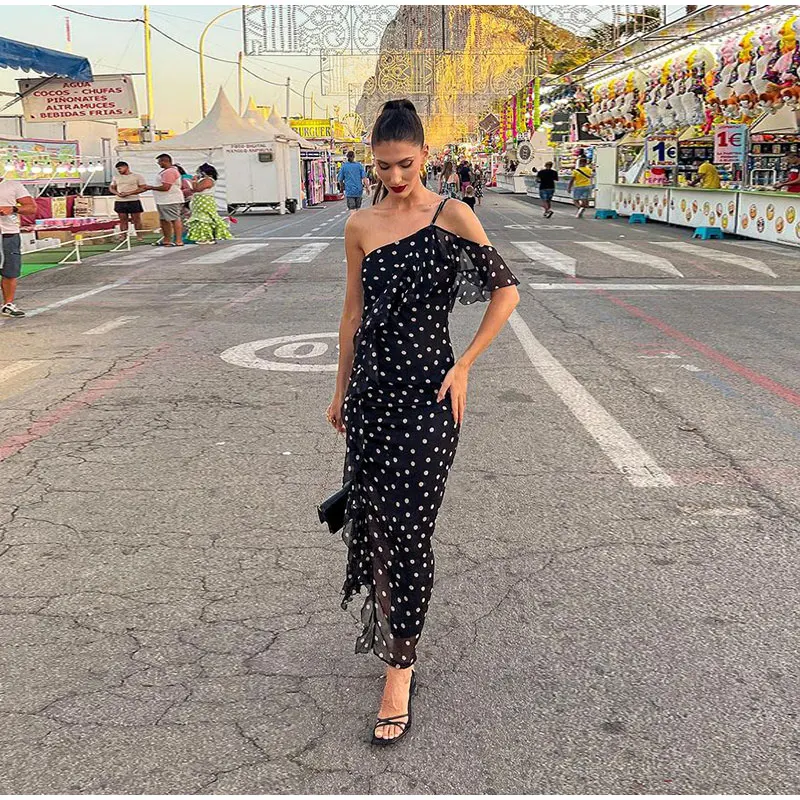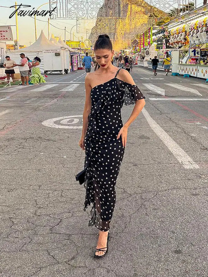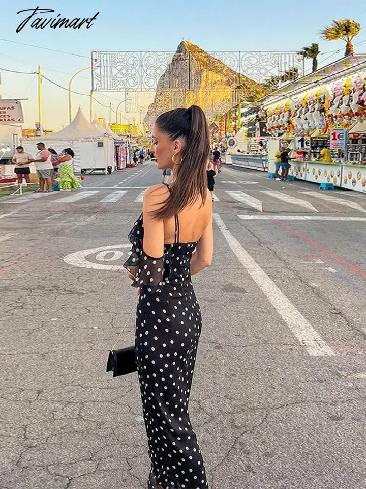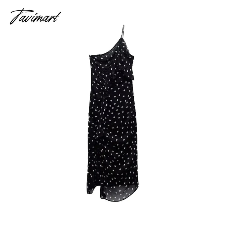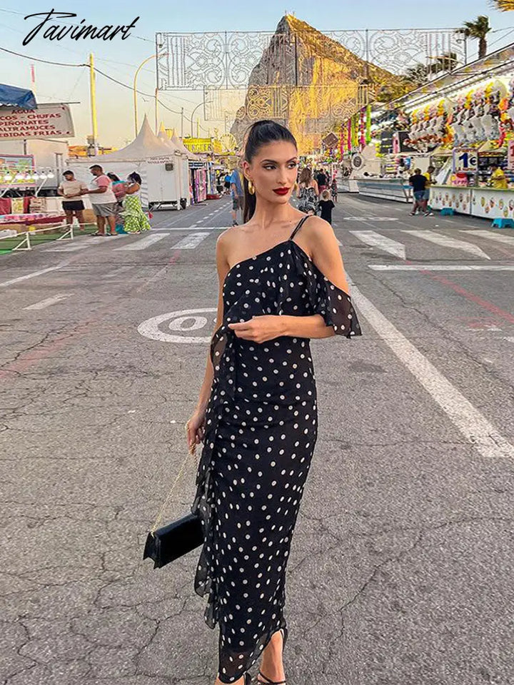 Tavimart Sexy Wave Point Single Shoulder Belt Split Midi Dress For Women Chic Diagonal Collar Backless Vestido Summer Lady Slim Robe