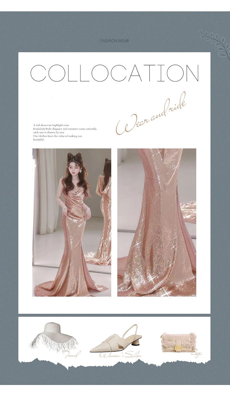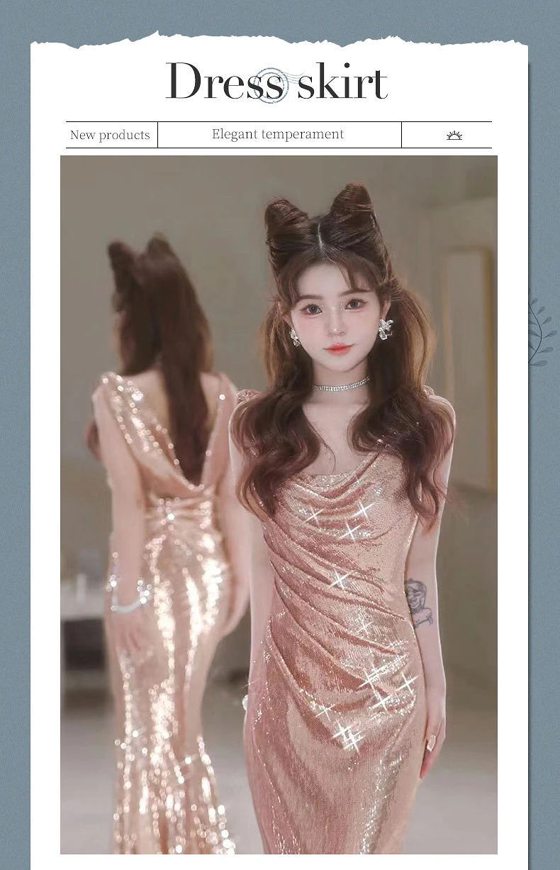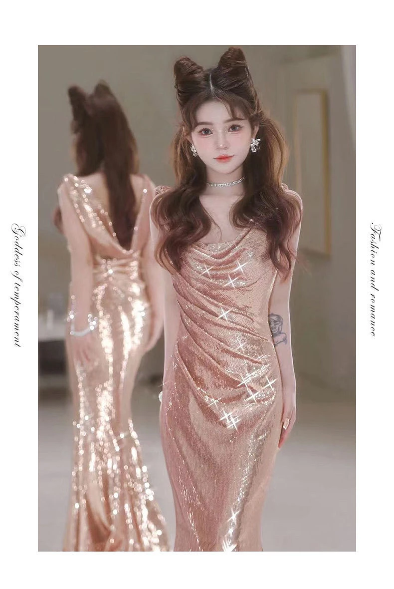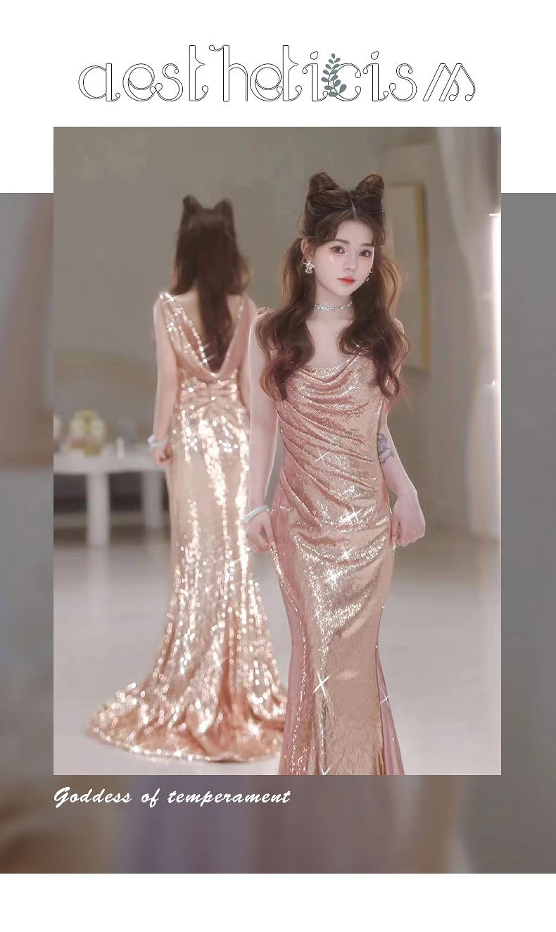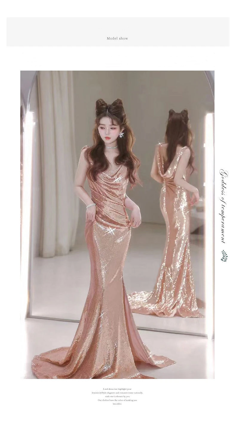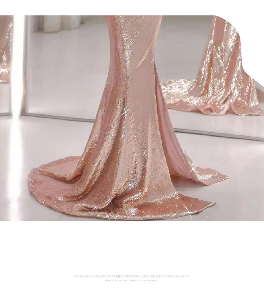 TAVIMART - Shiny Champagne Gold Celebrity Dresses Strapless V-neck Spaghetti Strap Mermaid Backless Sexy Zipper Evening Party Gowns