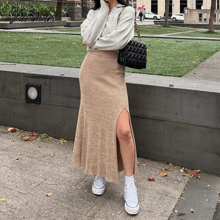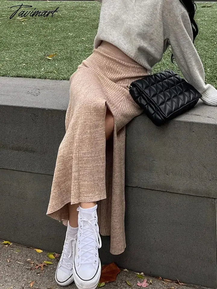 Tavimart Side Slits Knitted Skirt For Women High Waist Slim Sexy Hollow Out Maxi Skirts Femme Autumn Casual Long Skirt Woman