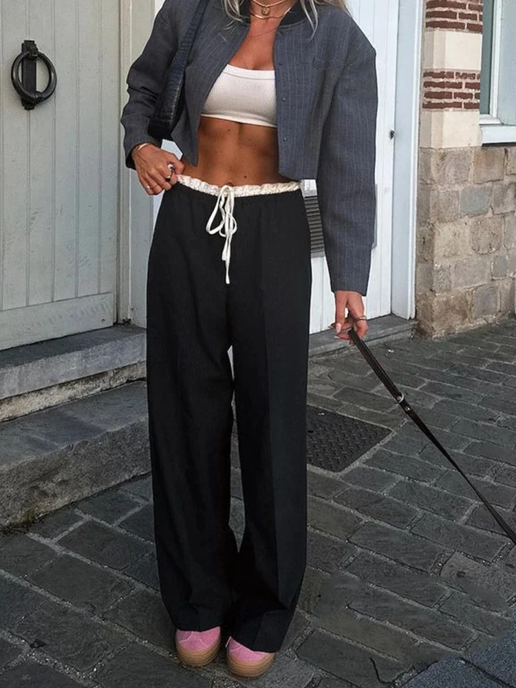 TAVIMART - Spring Streetwear Patckwork Black Women Pants High Waist Elastic Wide Leg Long Pants Fashion 2024 Summer Bow Tie Trousers