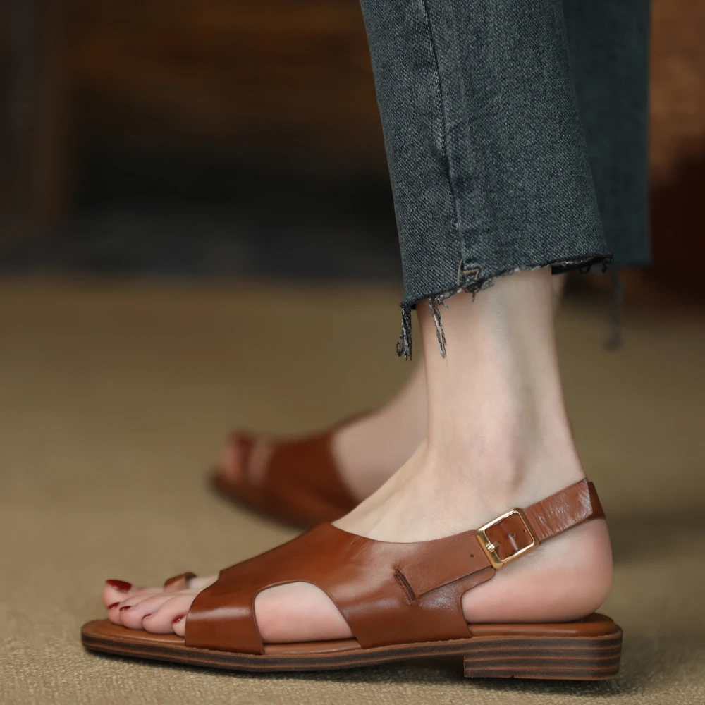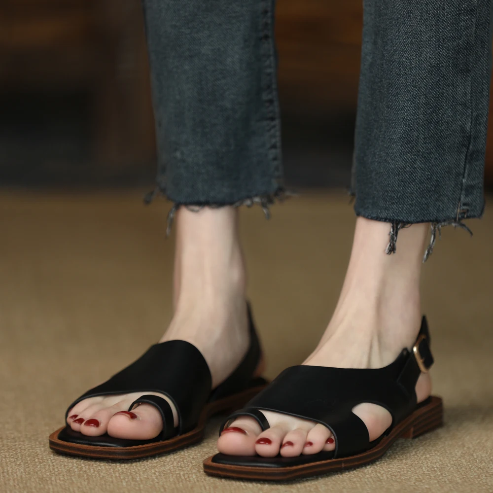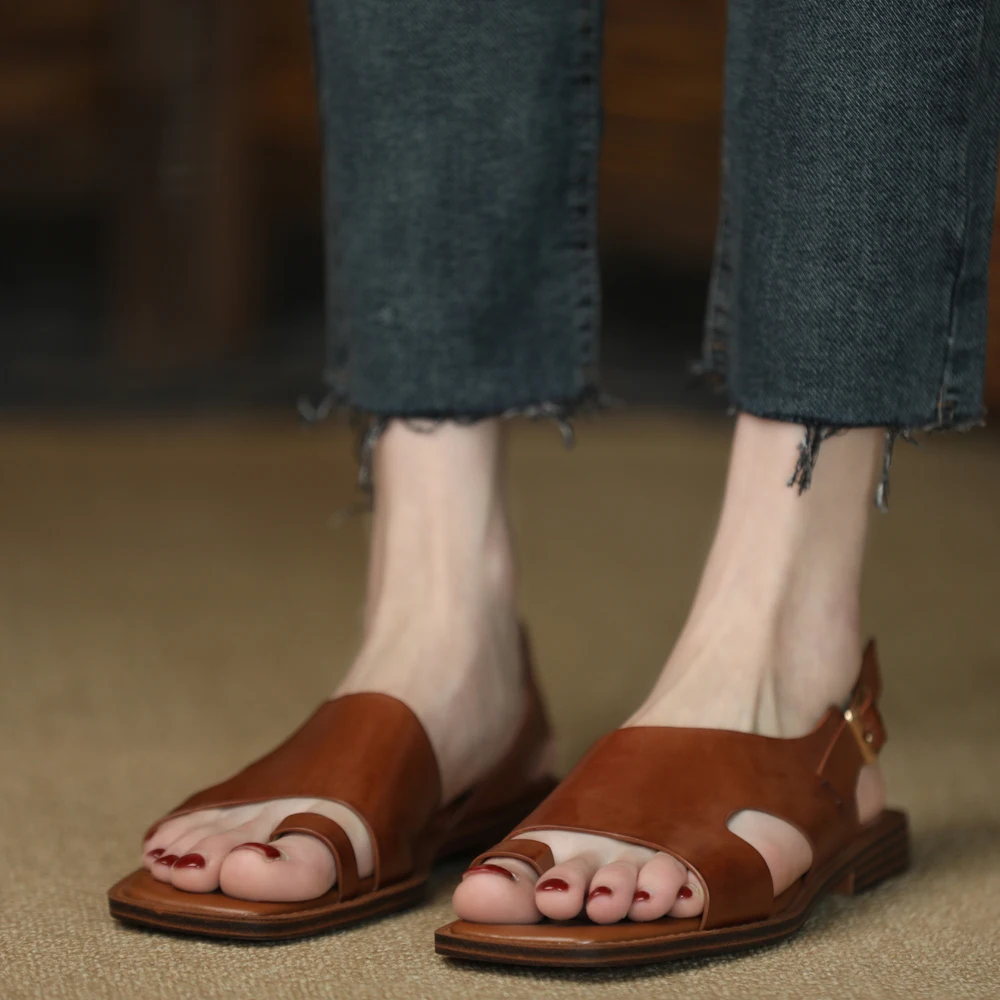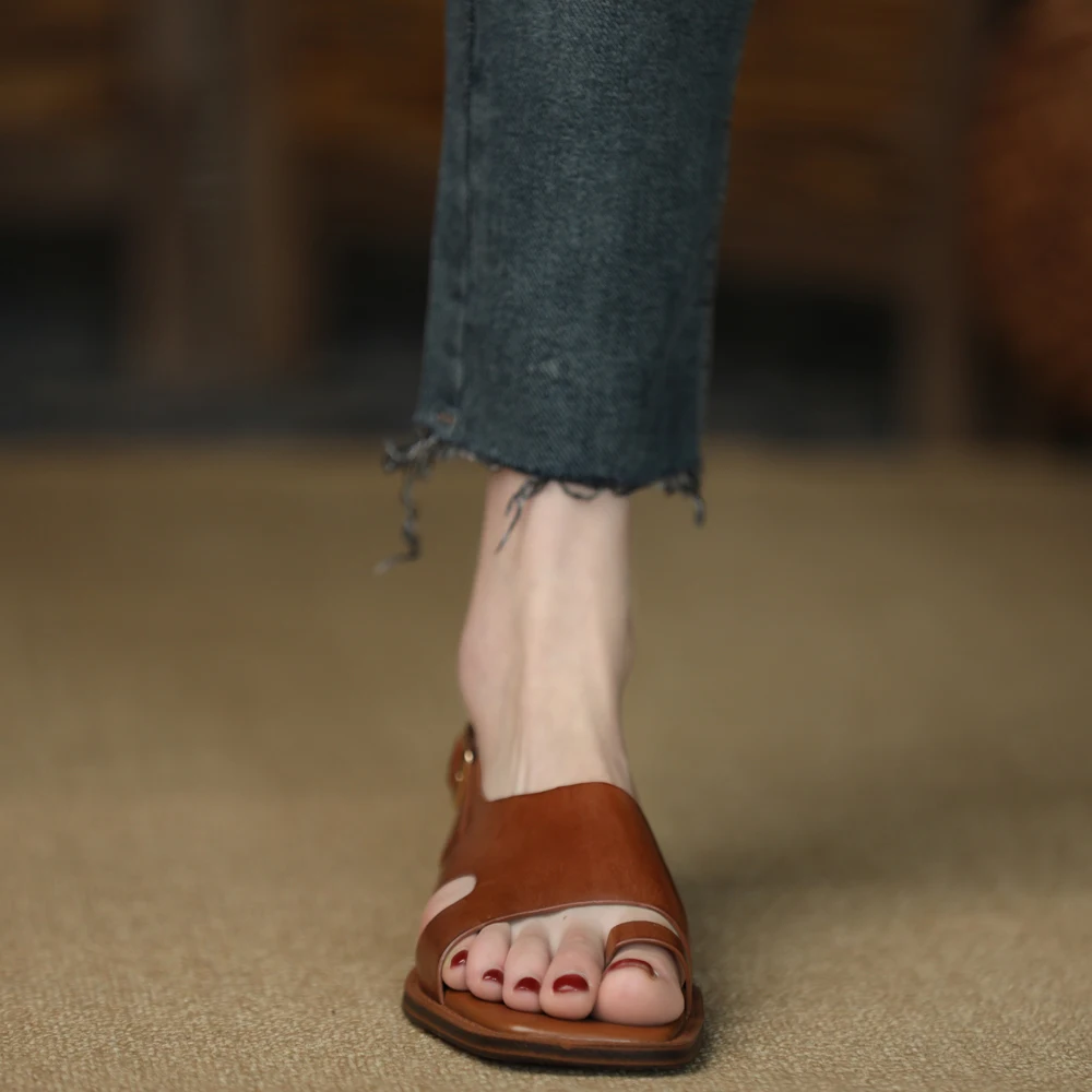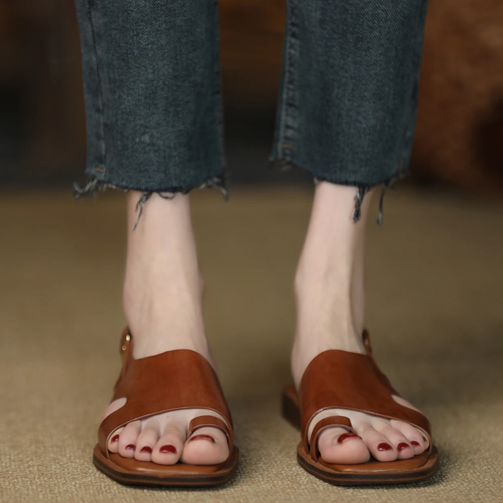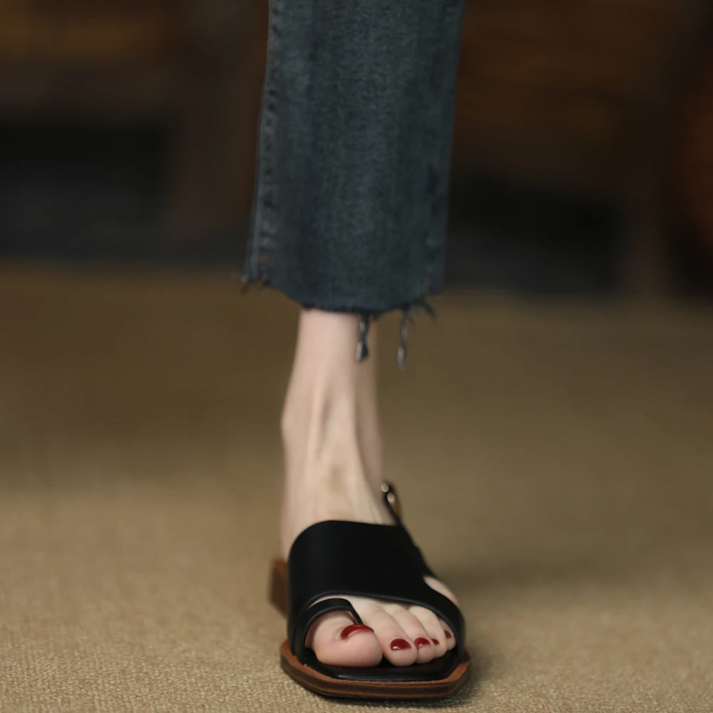 TAVIMART - Square Toe Sandalias Lady Flip Flops Cowhide Casual Shoes Woman Summer Sandals Retro Shoes On Flat Heel 2 CM