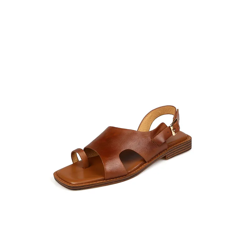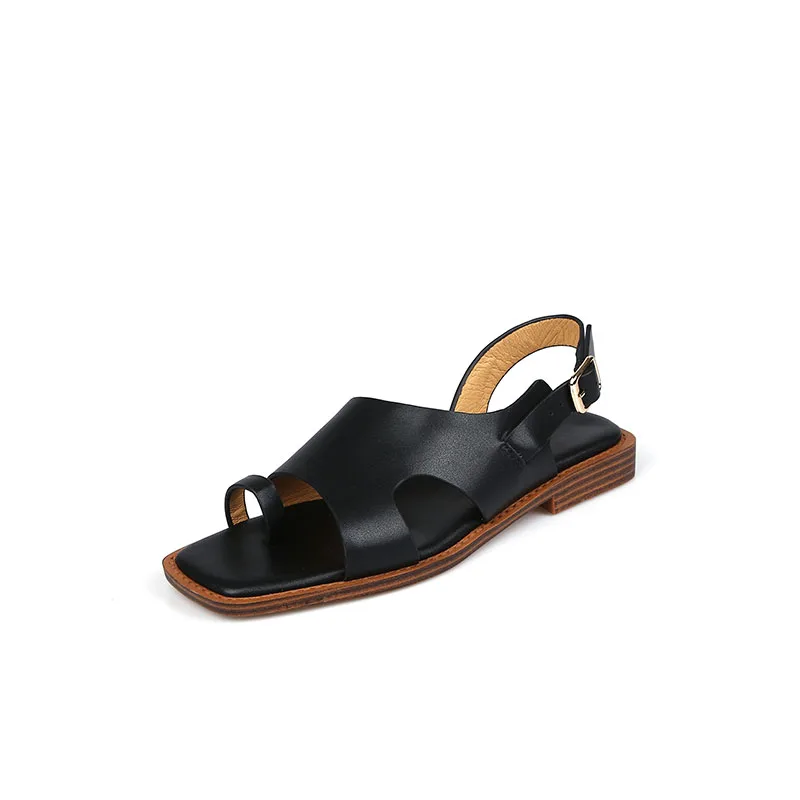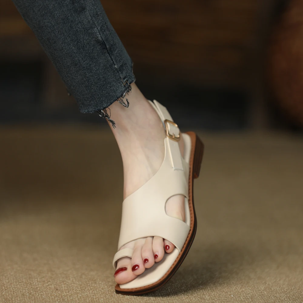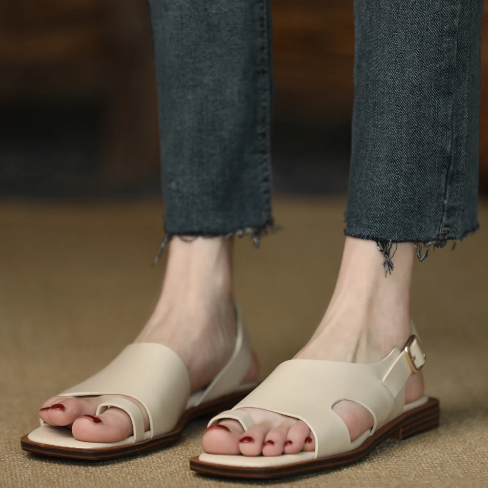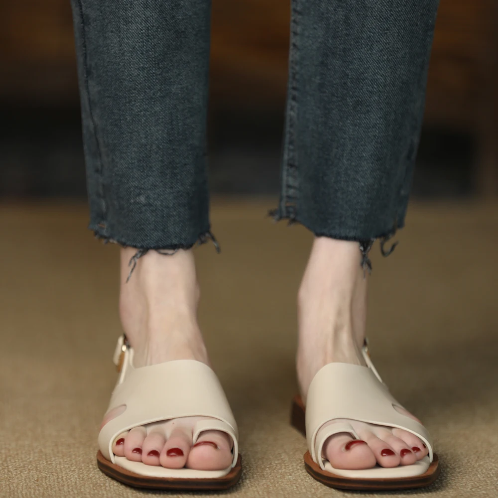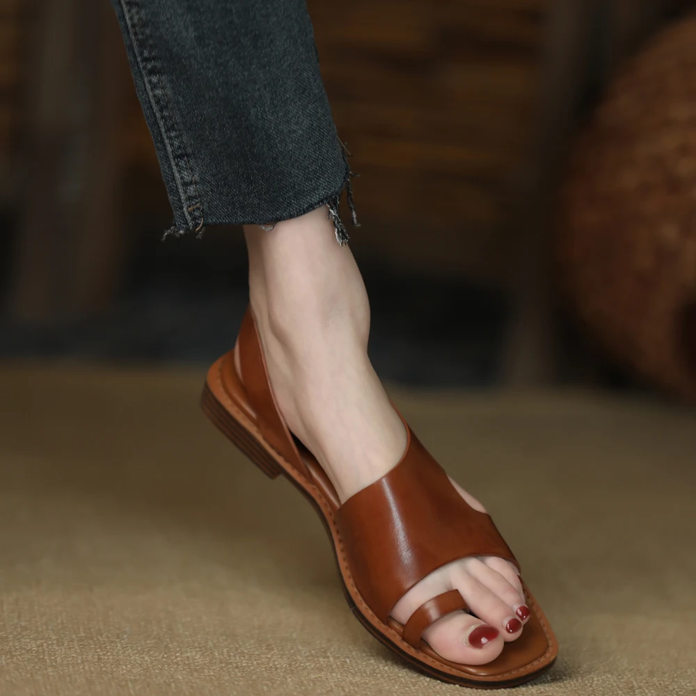 TAVIMART - Square Toe Sandalias Lady Flip Flops Cowhide Casual Shoes Woman Summer Sandals Retro Shoes On Flat Heel 2 CM