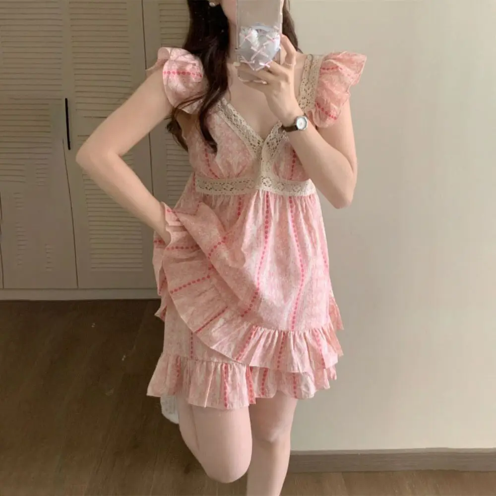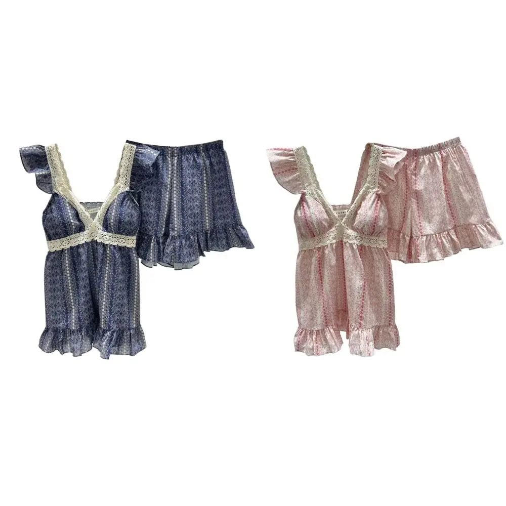 TAVIMART - Striped Suspender Shorts Pajamas Ruffle Sleeveless Floral Pajamas Suit Loose with Chest Pad Women's Sleepwear Sets Sleeping