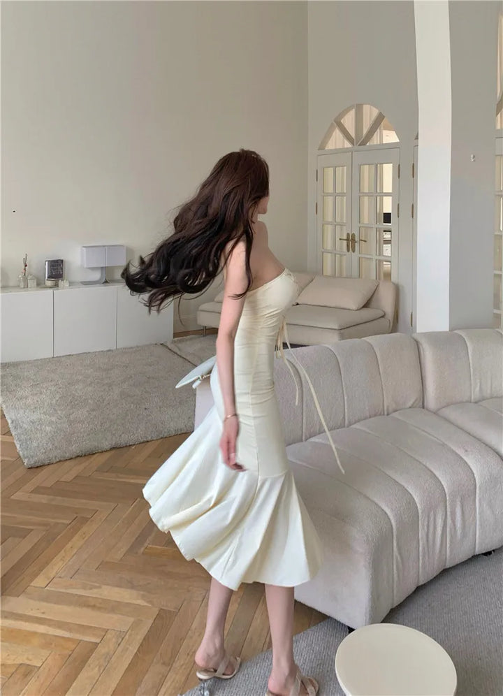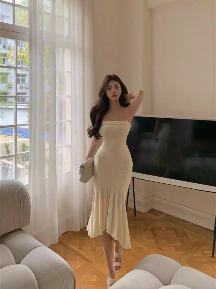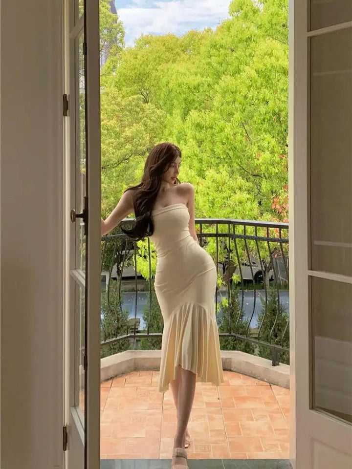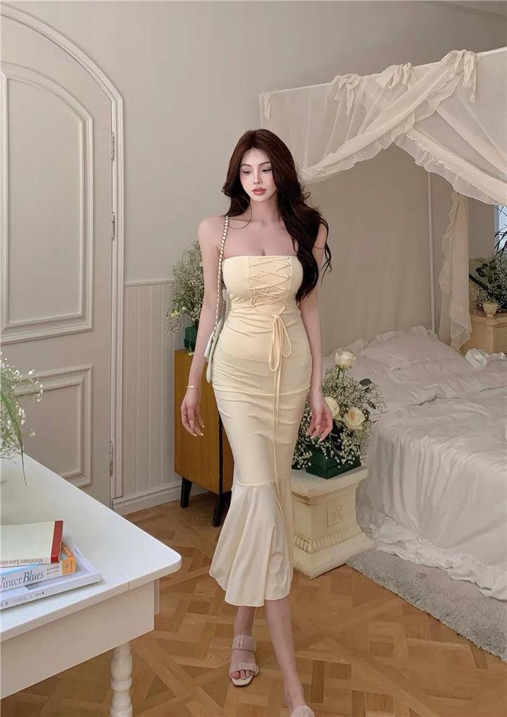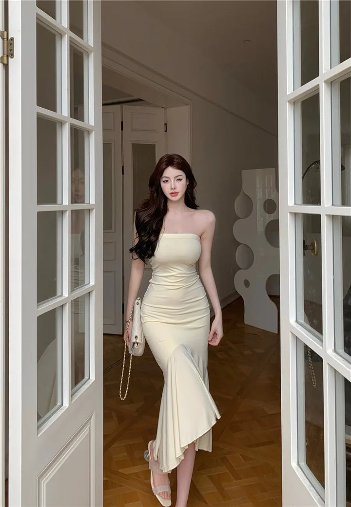 TAVIMART - Summer Aesthetic Midi Dress Women Strapless Fishbone Bandage Irregular Dress Party Club Sexy Elegant Dresses Backless Solid