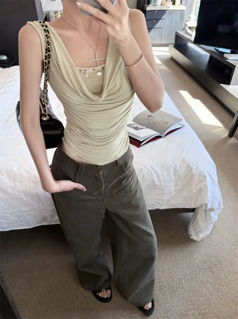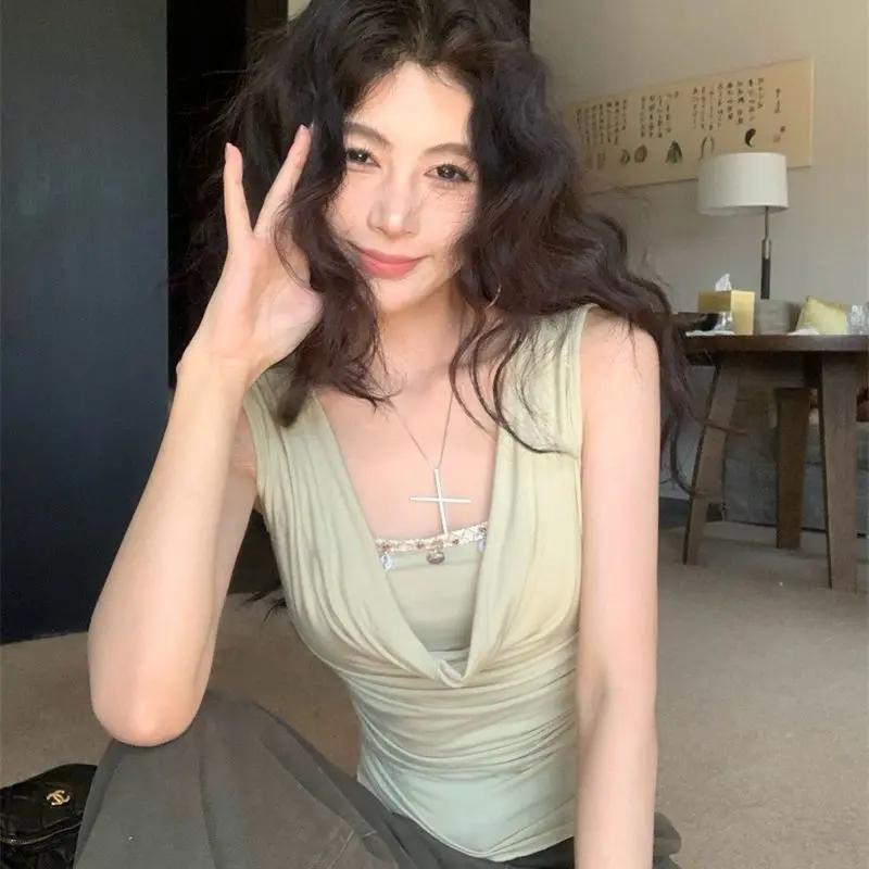 TAVIMART - Summer Cropped Corset Top Draped Neck Two Tone Sleeveless Built-in Layered Shirt Women Soft Sexy