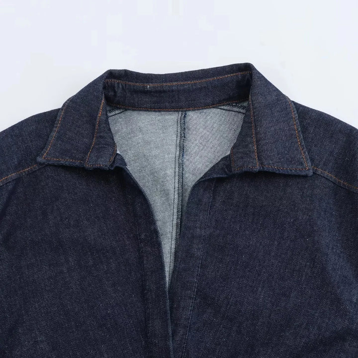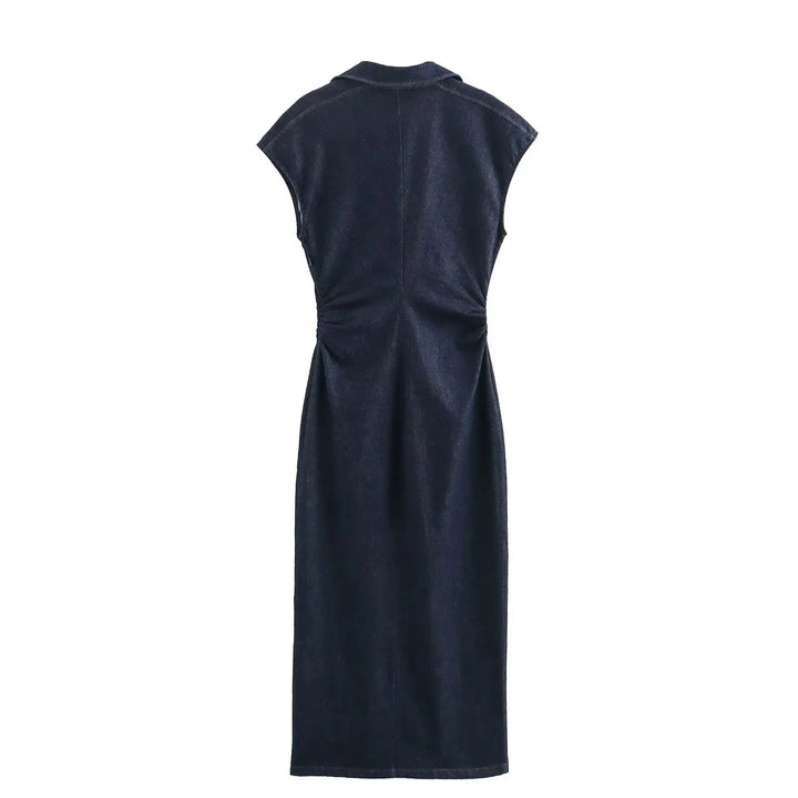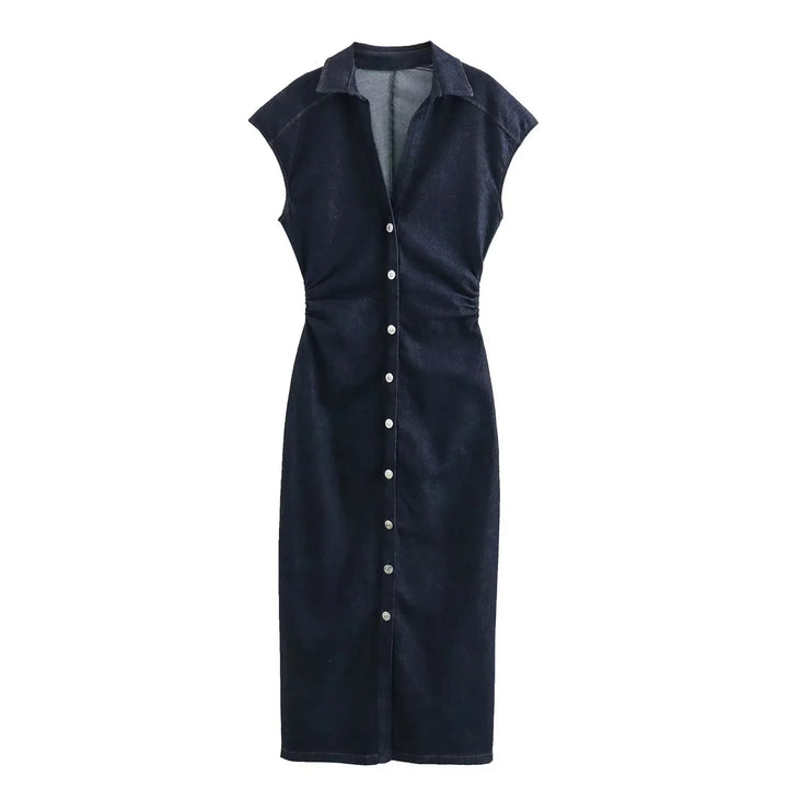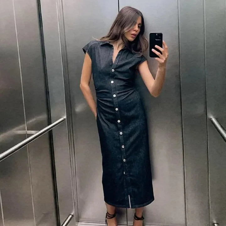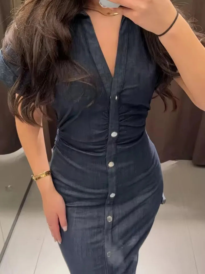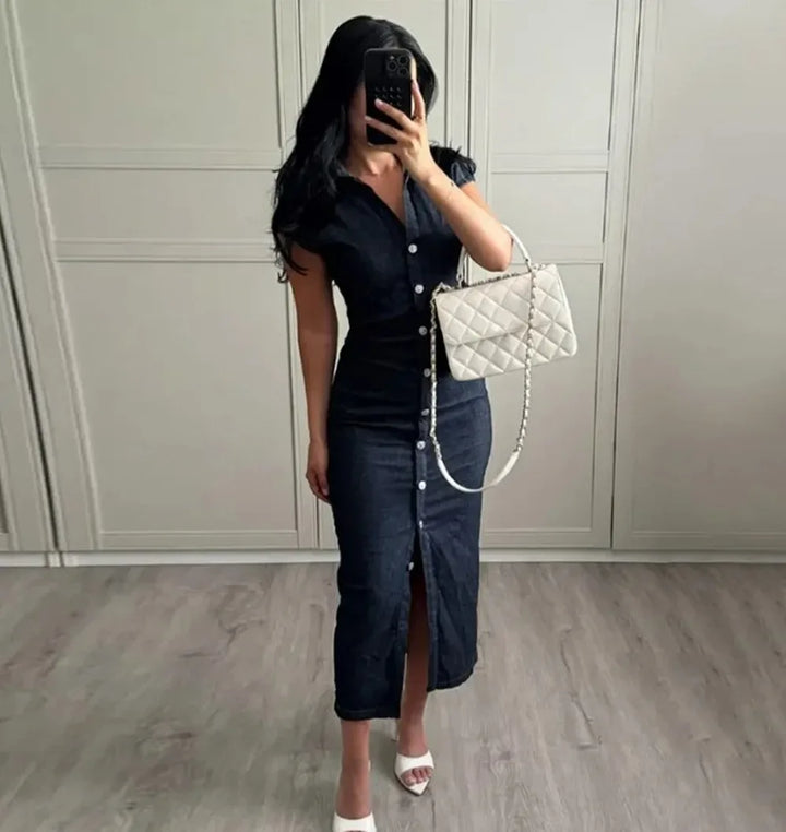 TAVIMART - Summer Denim Slim Long Dress Women Chic V Neck Single Breasted Short Sleeve Bodycon Dresses Ladies Elegant Dresses Outfits