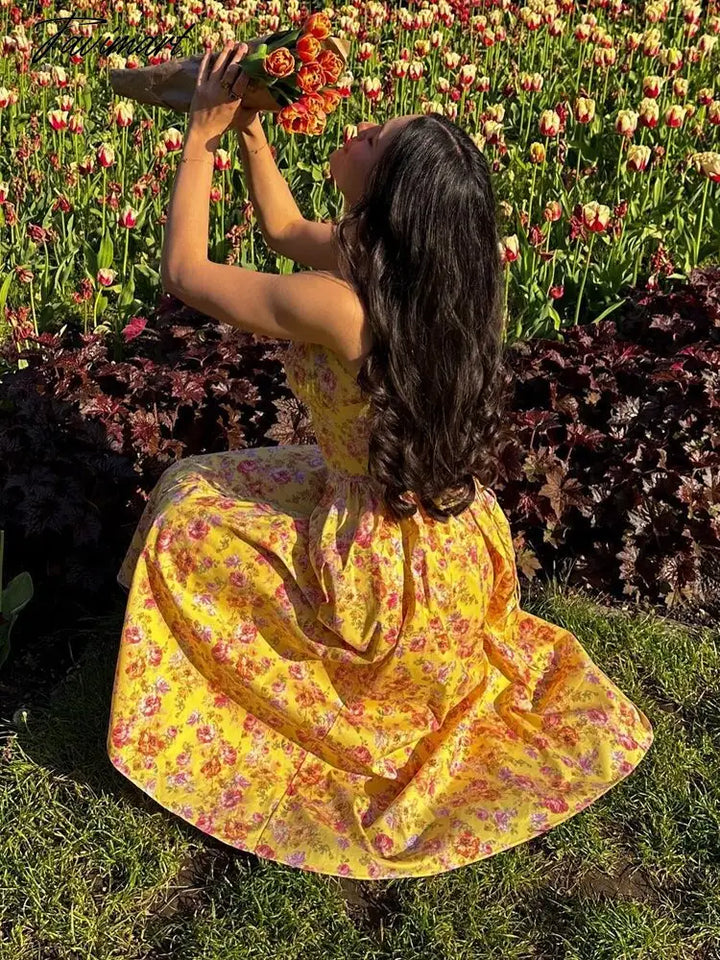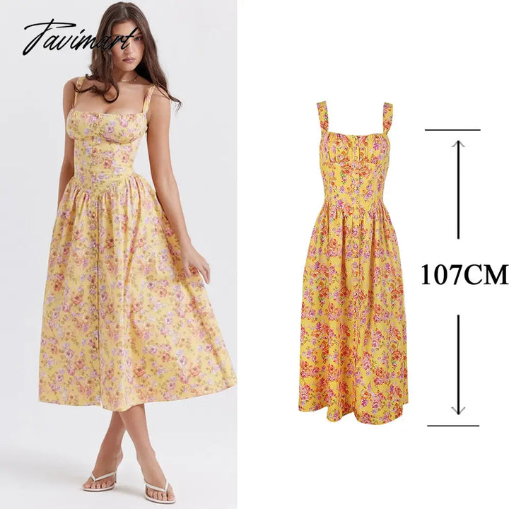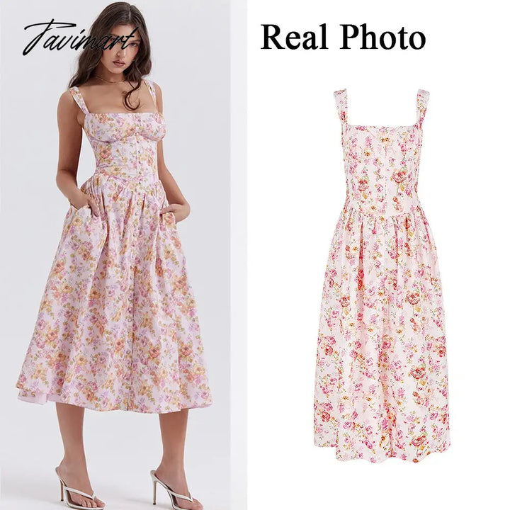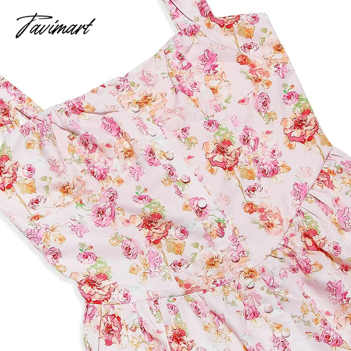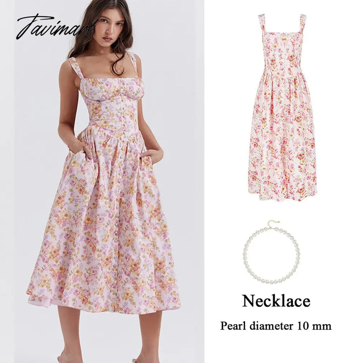 Tavimart Summer Elegant Midi Dress Casual Pink Button Floral Print Holiday Party Long Dresses for Women New In Dresses