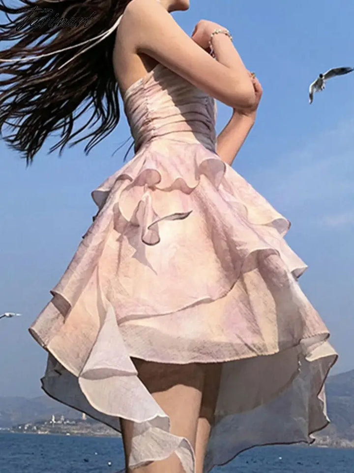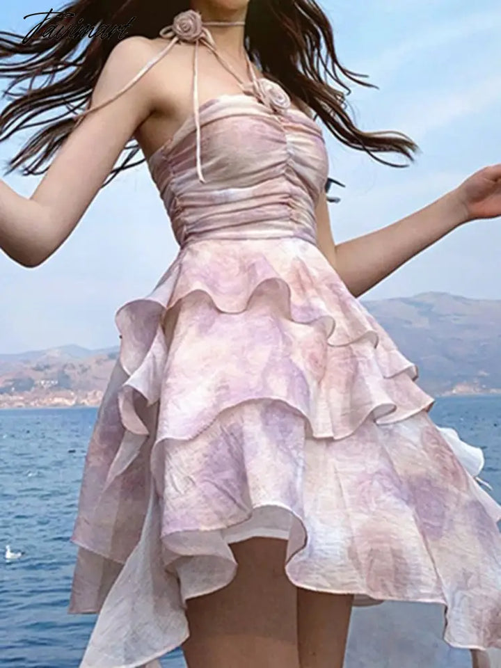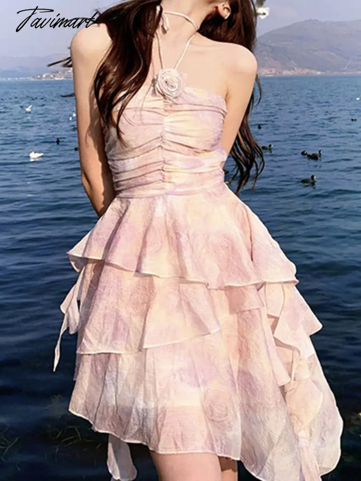 Tavimart Summer Fairy Mini Dresses Women Ruched Ruffles Irregular Print Boho Beach Dress Sexy Halter Backless Evening Party Vestidos