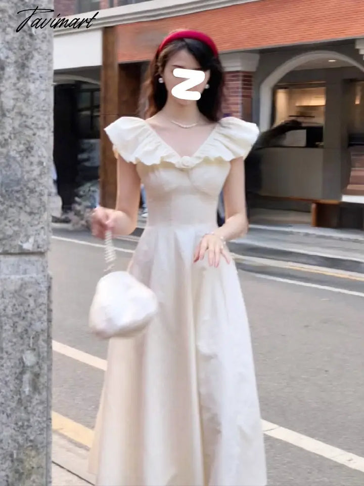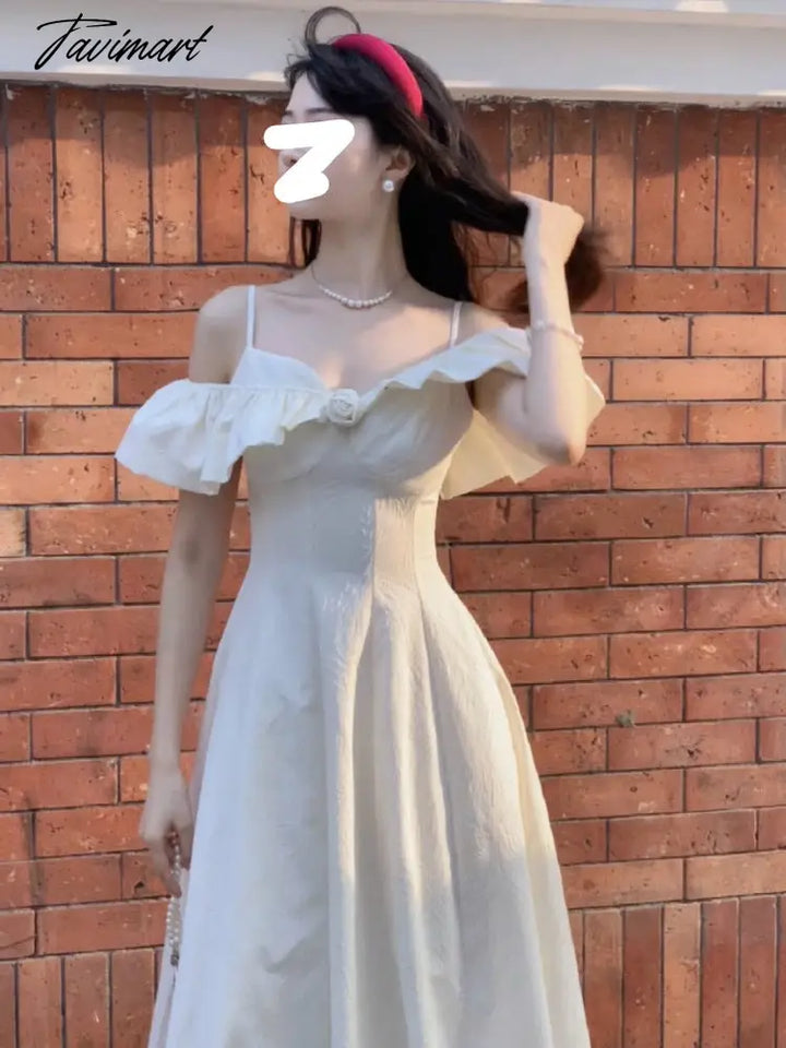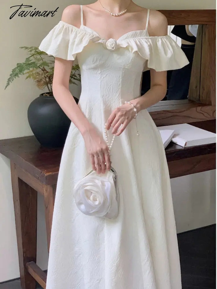 Tavimart Summer French Vinatge Elegant Midi Dress Women Slash Neck Off Shoulder Ruffles Patchwork High Waist A-line Dresses Korean Robe