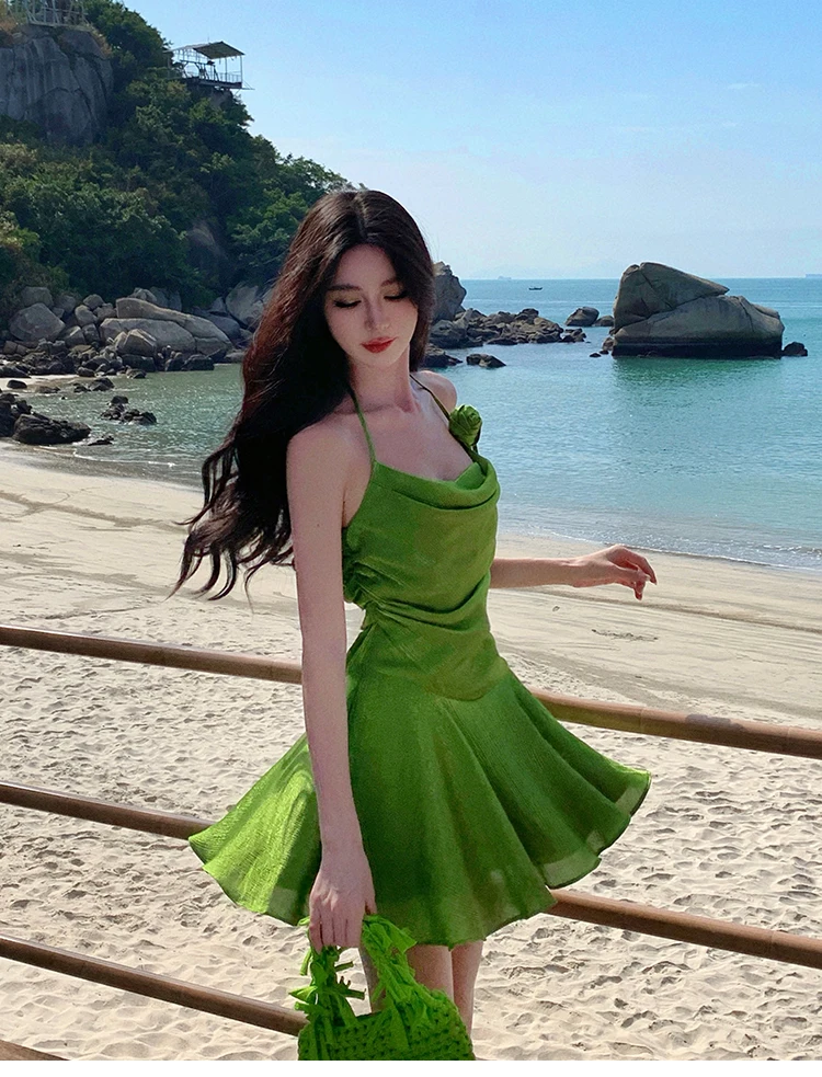 TAVIMART - Summer Green Sleeveless Slip Sexy Club Vacation Elegant Pleated Mini Dress 2024 New Fashion Evening Party Dress Women Streetwear