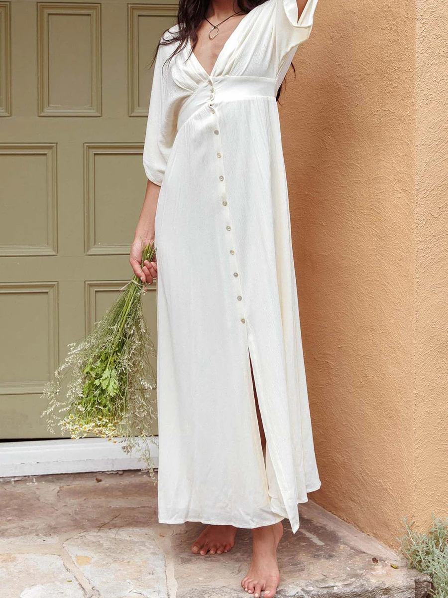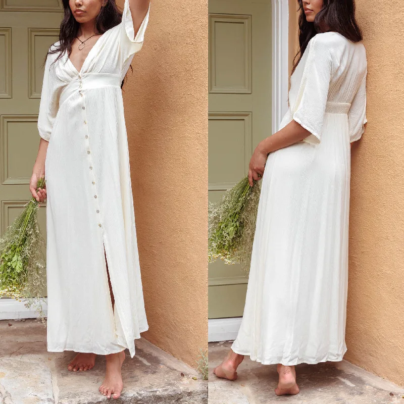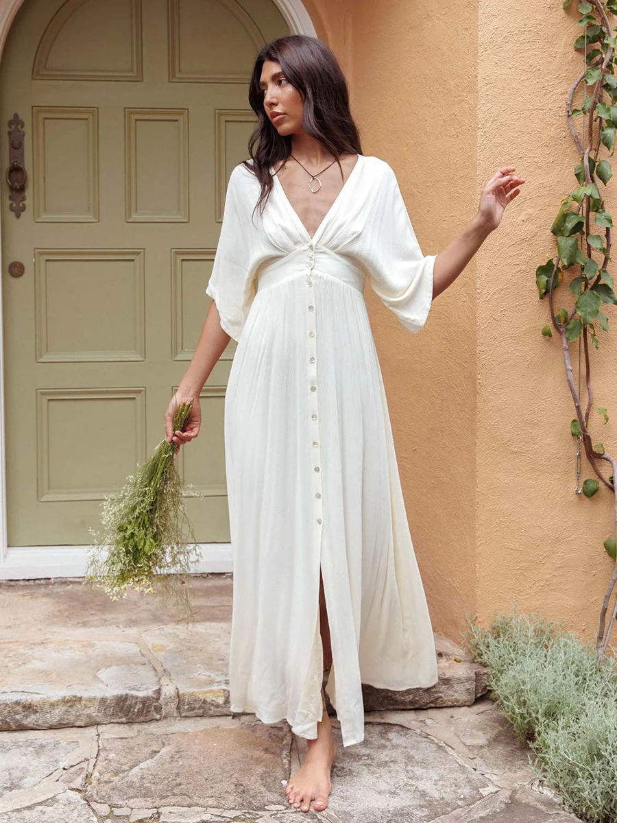TAVIMART - Summer New Casual White Long Dresses Elegant Single Breasted V Neck Short Sleeve Maxi Dress Women Simple Fashion Holiday Vestido