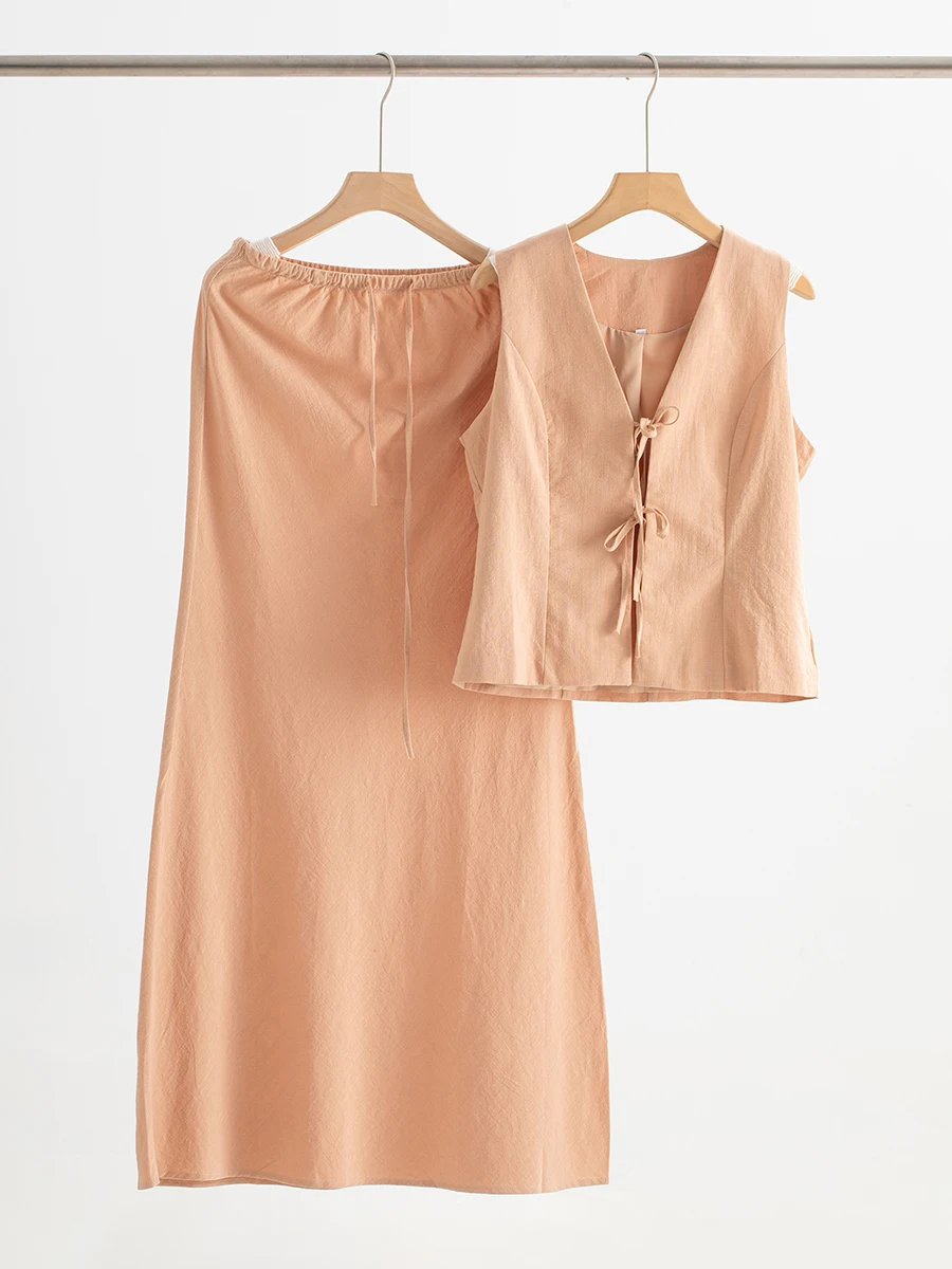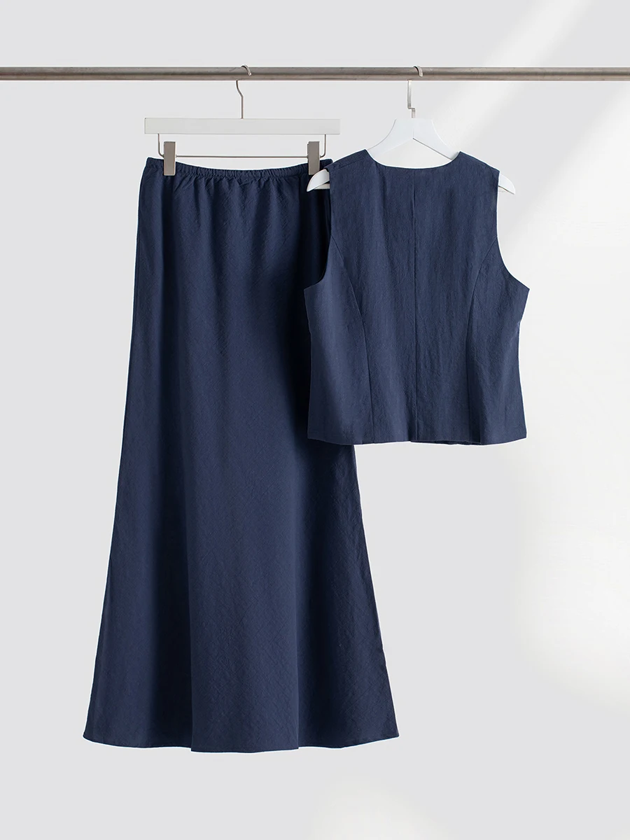 TAVIMART - Summer Solid Elegant Skirt Set Women New V Neck Sleeveless Lace-up Vest+Drawstring Long Skirts Vintage Fashion 2 Piece Sets