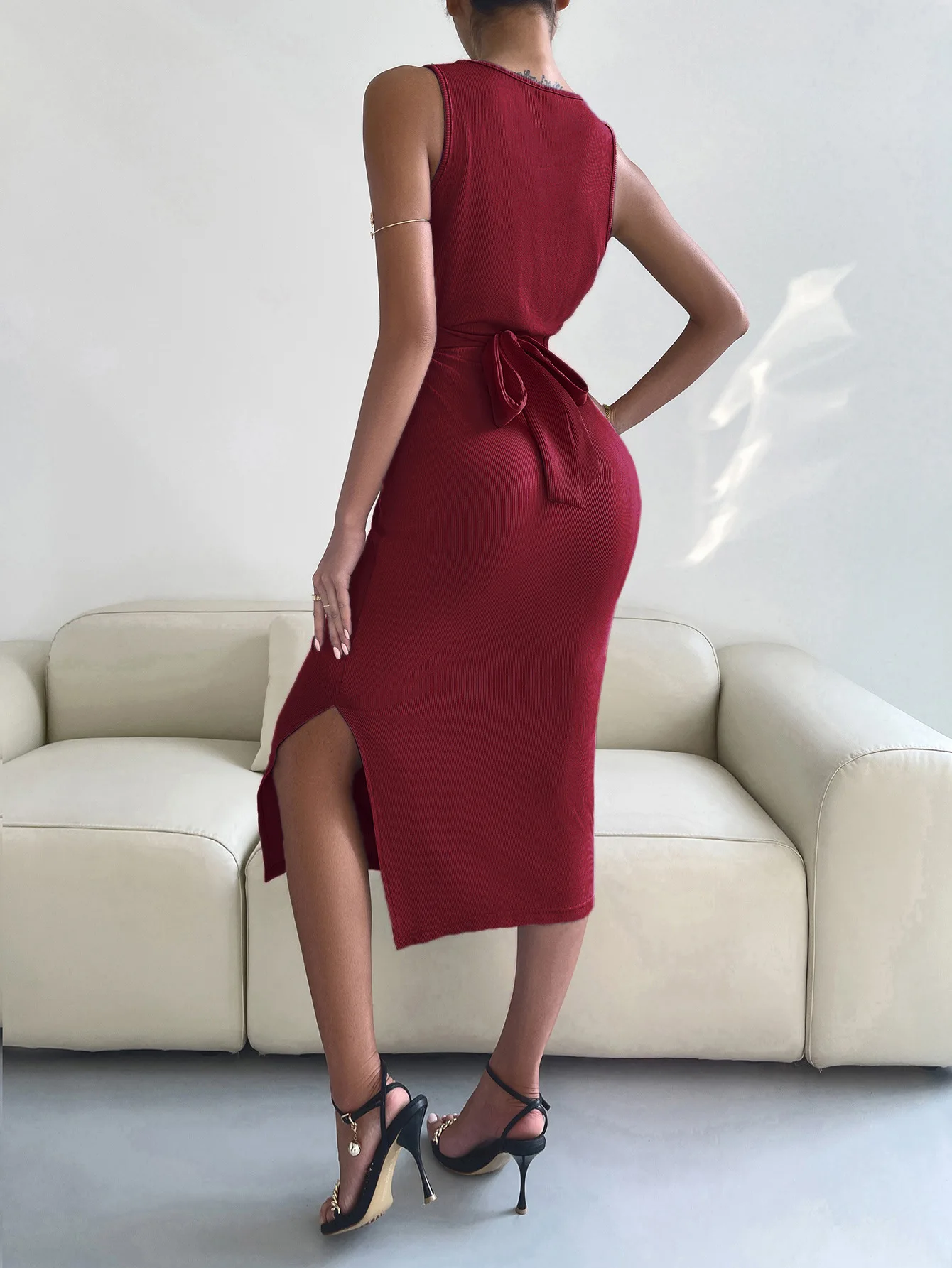Tavimart Summer Women's Tight Mid-Length Dress Knitted Women's Clothes Waisted Office Dress Elegant Slit Party Mid-Length Dresses