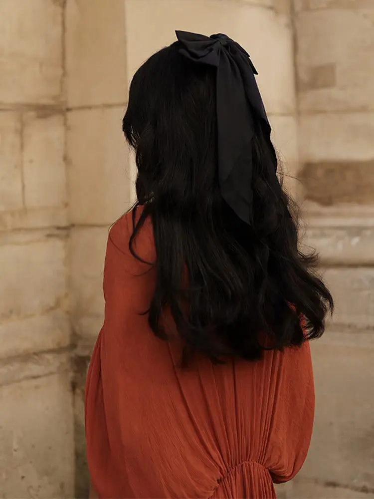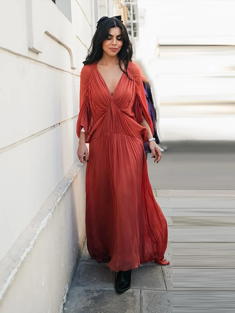 TAVIMART - V-Neck Pleated Long Dress Bat Shaped Elastic Waist Cinched Chiffon Robes Loose Slimming Wrinkled Women Maxi Dresses Summer New