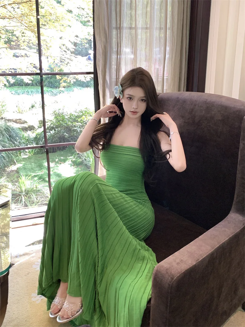 TAVIMART - Vintage Green Elegant Backless Vacation Party Long Dress Women Summer Black Strapless Pleated Knit Sundress Fashion Simple Trend