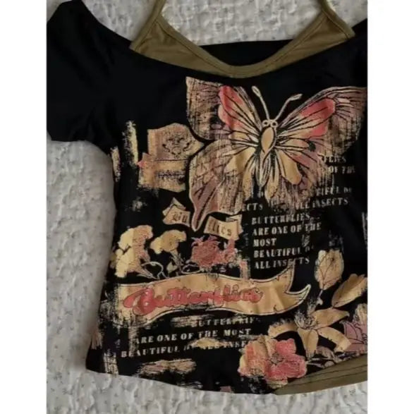 TAVIMART - Vintage Print Pattern Fake Two-piece T-shirt Harajuku Style Hot Girl Fake Two T-shirts Harajuku Style Hip Hop Y2k Top
