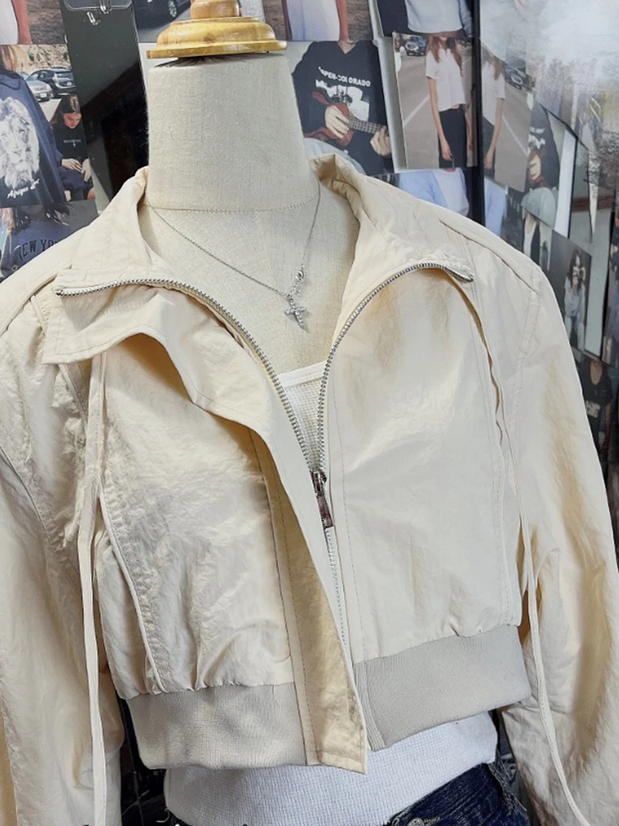 TAVIMART - Vintage Solid Drawstring Jackets For Women Basics Streetwear Turn-down Collar Cardigan Coat Simple Y2K Harajuku Crop Top Female