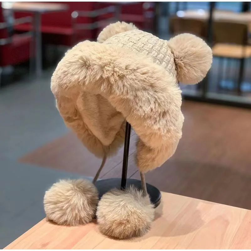 Tavimart Winter Woollen Hat Women Cute Ball Ear Protector Plush Hat Fur Pullover Hats Fashion Warm Christmas Thickened Lei Feng Hat