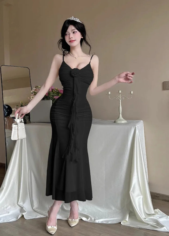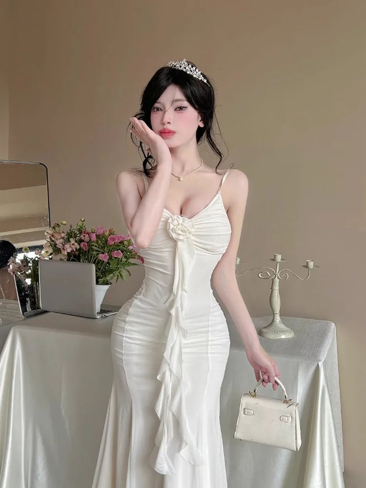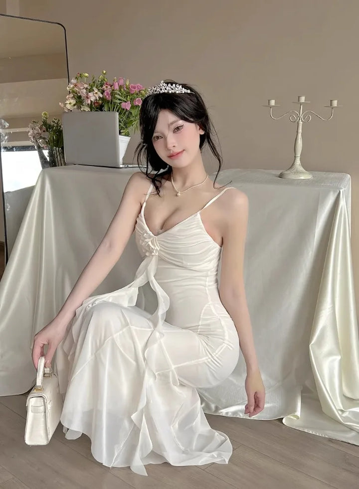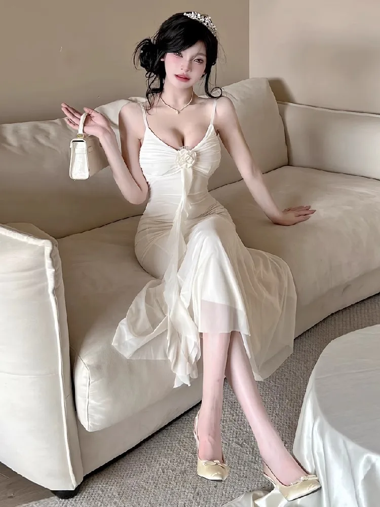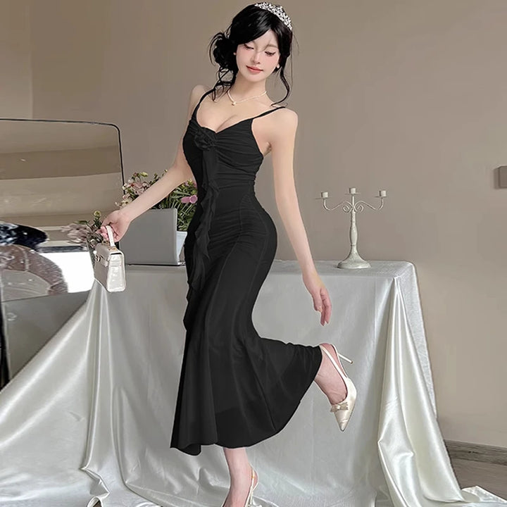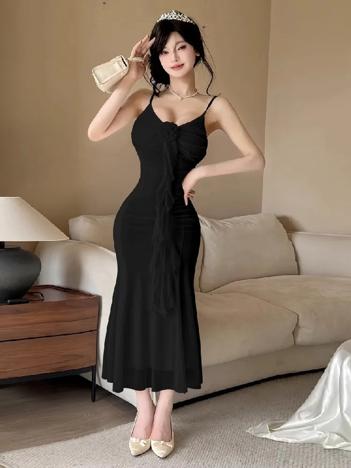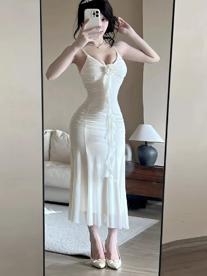 TAVIMART - Women Dresses Sleeveless V Neck Ruffles Slim Elegant Backless Ruffles Ribbon Temperament Elegant Dress Sexy Ladies