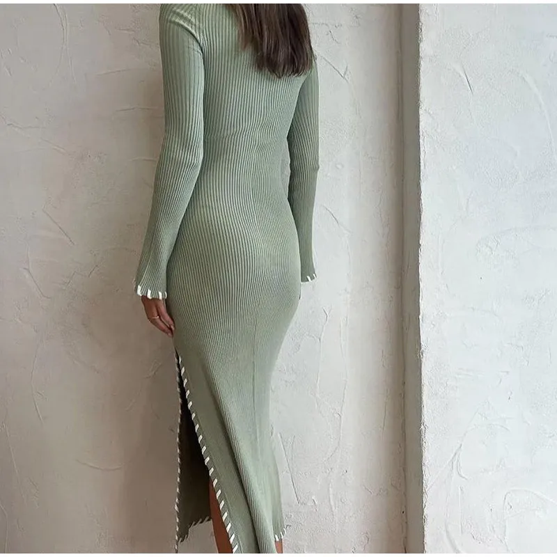 Tavimart Women Square Collar Split Knitted Maxi Dresses Long Sleeve Off Shoulder Slim Vestidos Winter Sexy Fashion Vacation Robes