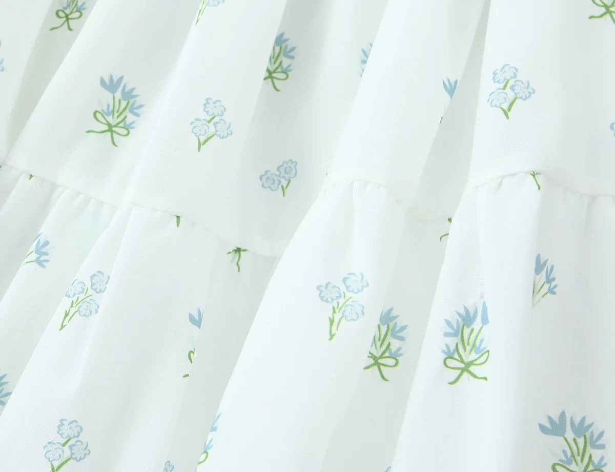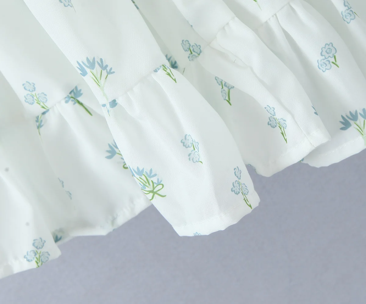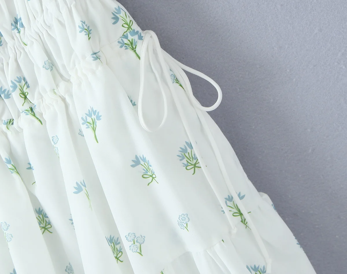 TAVIMART - Women Vestidos Sweet White Flower Print Bow Ruched Elastic Body Short Puff Sleeve Mini Dress Girl Ruffles Hem Swing Robe Fairy