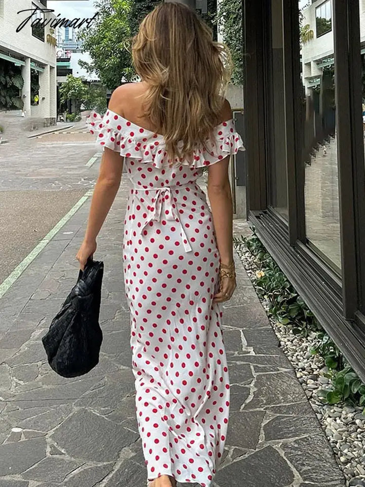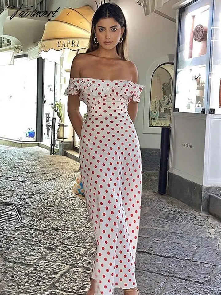 Tavimart Women's Summer Polka Dot Printed A-Line Dress Sexy one word neckline dresses Ruffled Vintage Dresses Home Party Dresses y2k