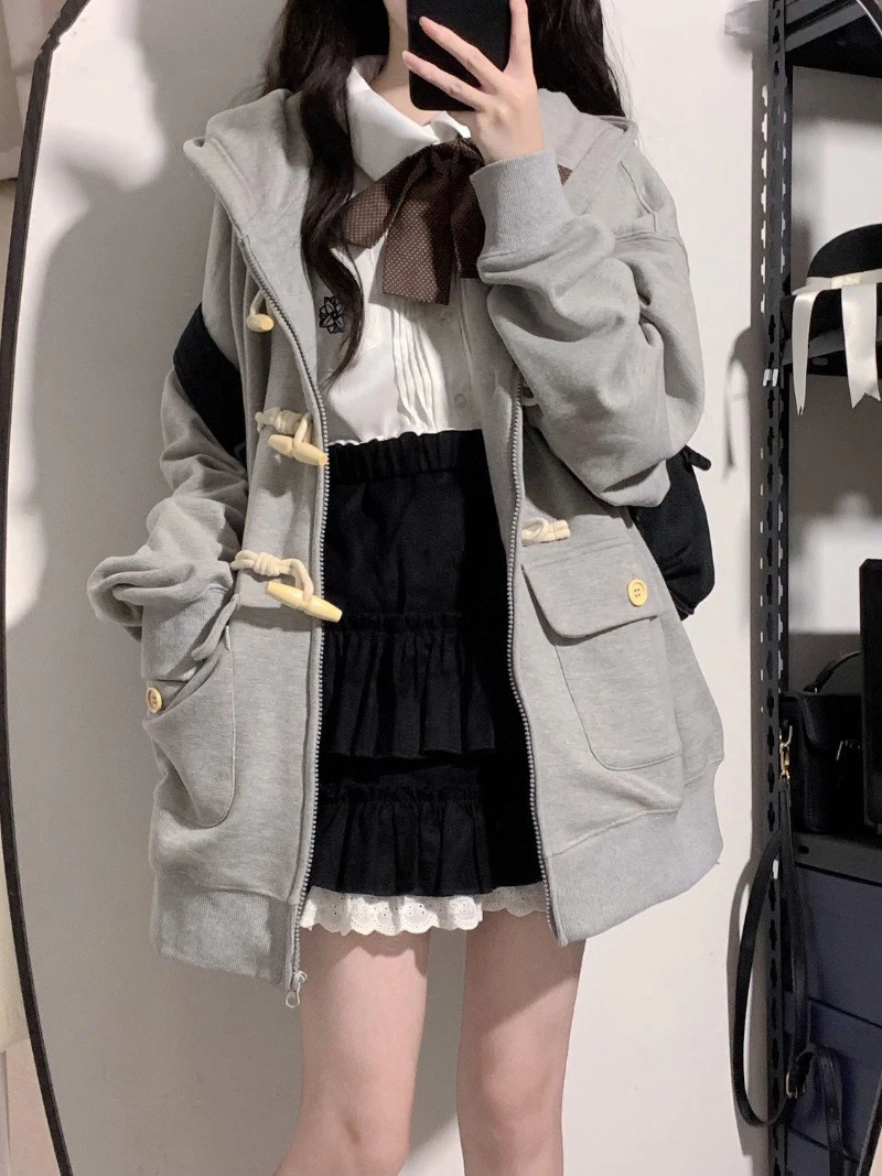 TAVIMART - Women's Cardigan Hooded Sweatshirt Cute Loose Coat Zipper Spring Autum Long Sleeves Buttons Pockets Solid Color Tops Jacket
