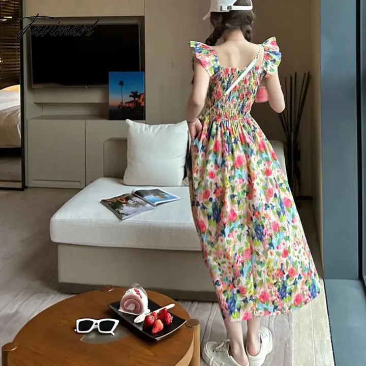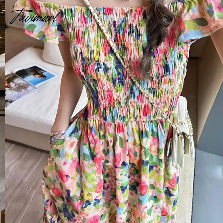 Tavimart Women's Dress Summer Boat Neck off-the-Shoulder A- line Dress Oil Painting Printing French Gentle High Waist Dress