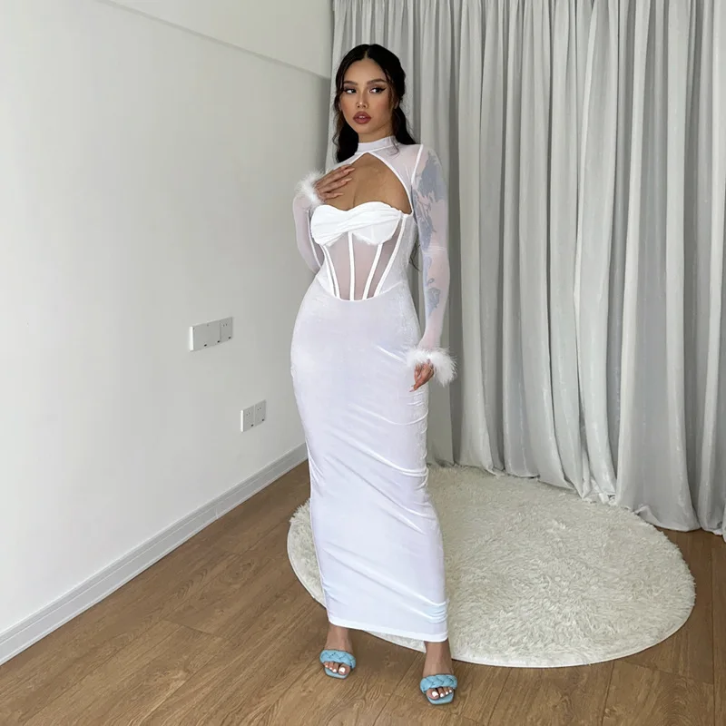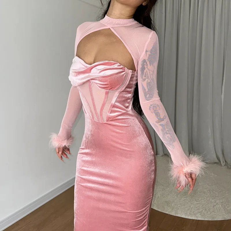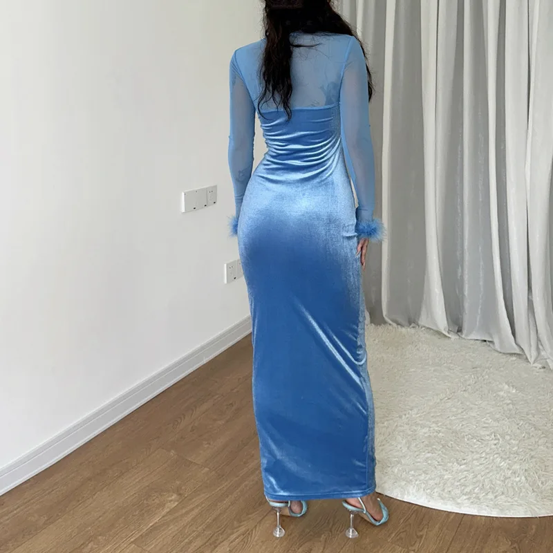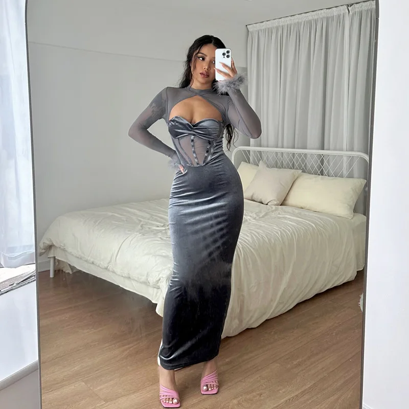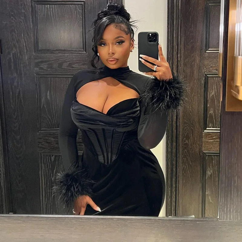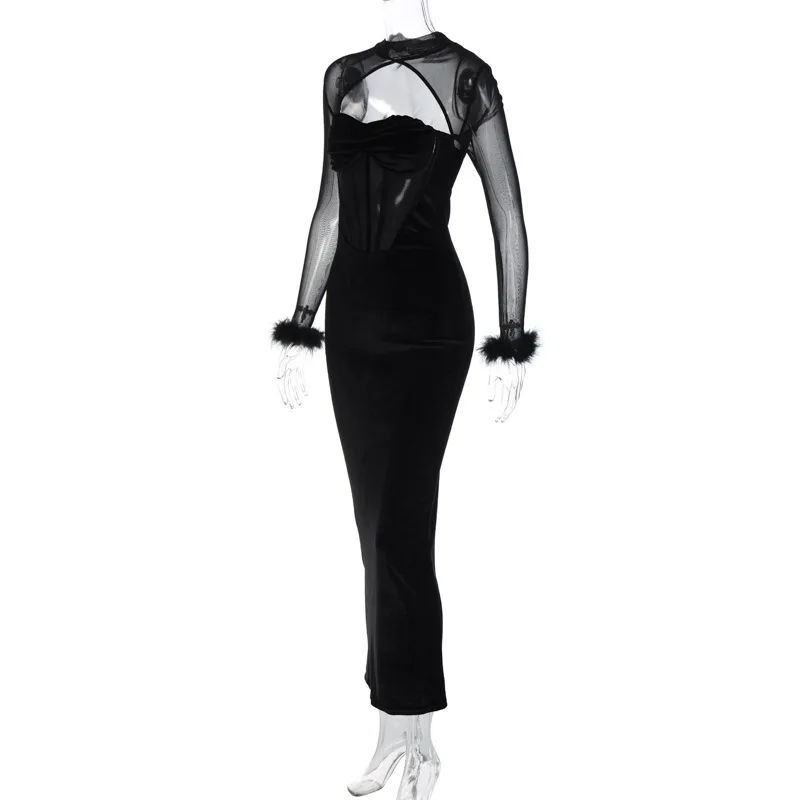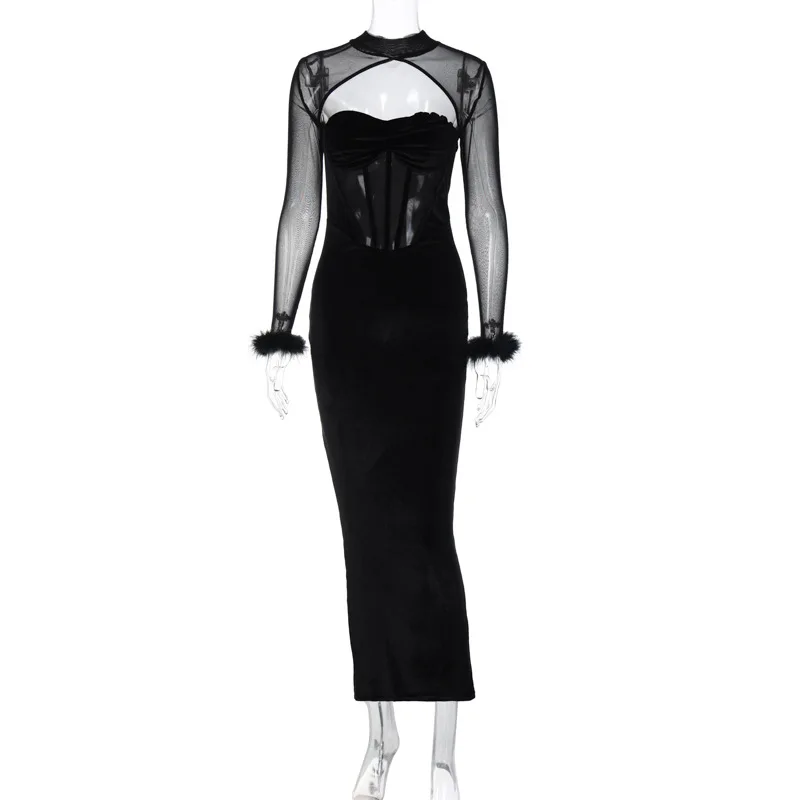 Tavimart Women's Feather Mesh Dress, Suede Black Dress, Hipster Sexy, Hollow Out, Long Sleeve, Long Dresses, Party Nightclub Wear, Y2K