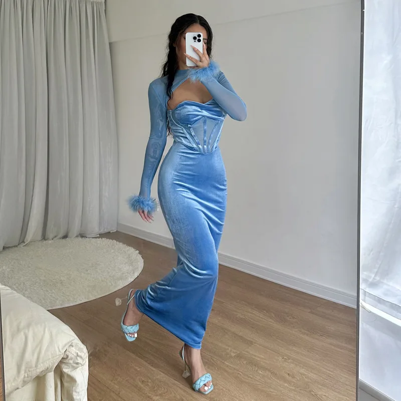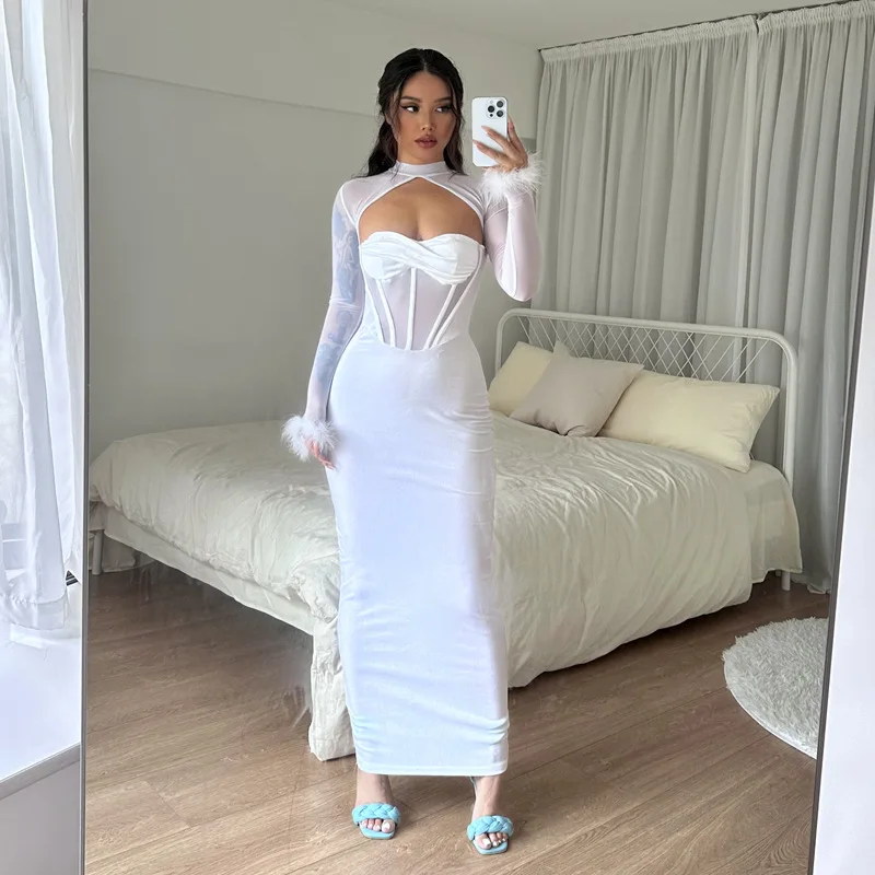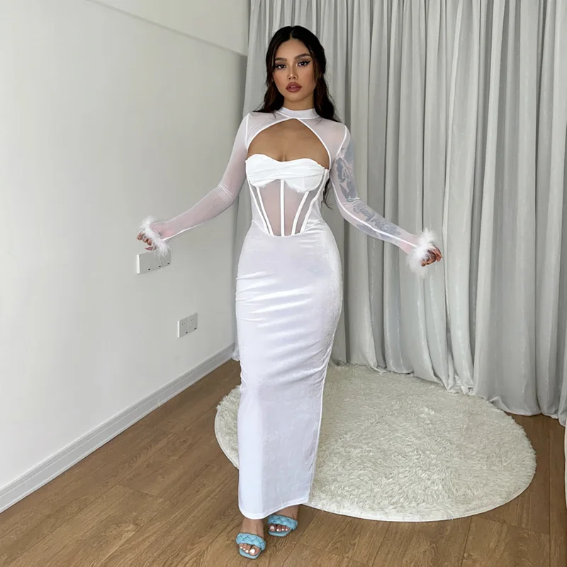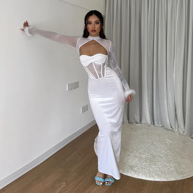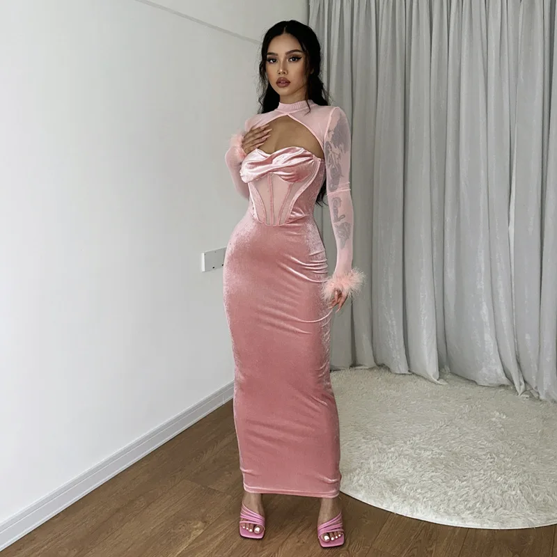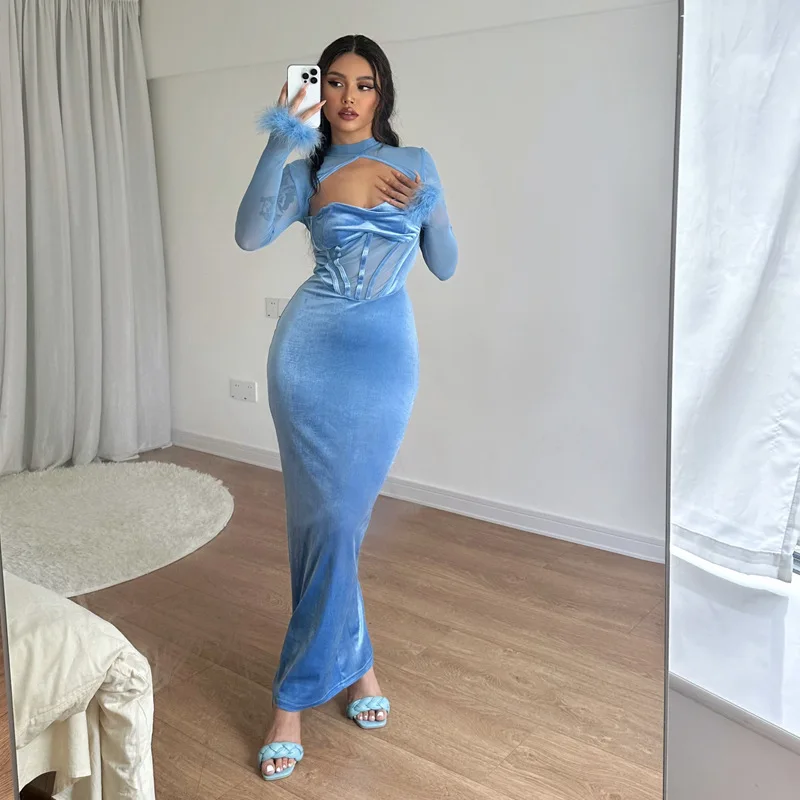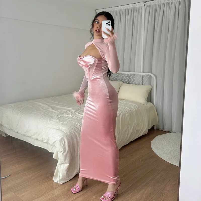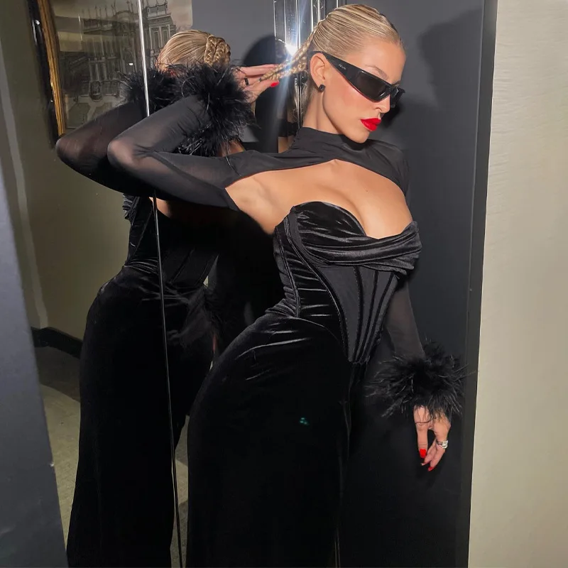 Tavimart Women's Feather Mesh Dress, Suede Black Dress, Hipster Sexy, Hollow Out, Long Sleeve, Long Dresses, Party Nightclub Wear, Y2K